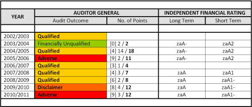 I have included in the table above the municipality’s credit rating, where they were available in its annual reports. Every municipality outsources to an independent agency an assessment of their long and short term financial viability, based on a range of fundamental criteria. In short, the better the rating, the more likely the municipality will be able to repay a loan as promised, on time and in full; the worse the rating, the less the chances and the more the indictment of that institution. The ratings are then applied to the municipality’s long and short term prospects.