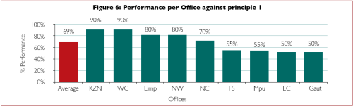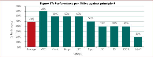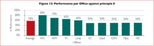 Essentially, this principle concerns the way in which the various Offices deal with misconduct. While the Western Cape tied KwaZulu-Natal with the best score (90%), it is worth highlighting the showing of the worst performer: Gauteng (50%). Its rating was, in large part, the result of the inordinate average number of working days it takes to process a complaint of misconduct – an extraordinary 284. The next worst, the North West, took 110 – still a lot but nothing like Gauteng. With regards to Gauteng, the report notes: “In the case of Gauteng, no reasons were submitted to explain the excessive time taken to resolve cases, despite the fact that the Office had been given an opportunity to provide comments.”
