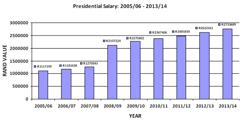 Context: The graph below sets out how the President’s salary has grown over the last nine years. A significant increase occurred under President Mbeki, just before Zuma took office, when it jumped by almost R1 million, from approximately R1.2m to R2.1m in 2008/09. Zuma’s current salary makes him among the best-paid state-leaders in the world. Indeed, possibly among the top ten, certainly the top twenty.