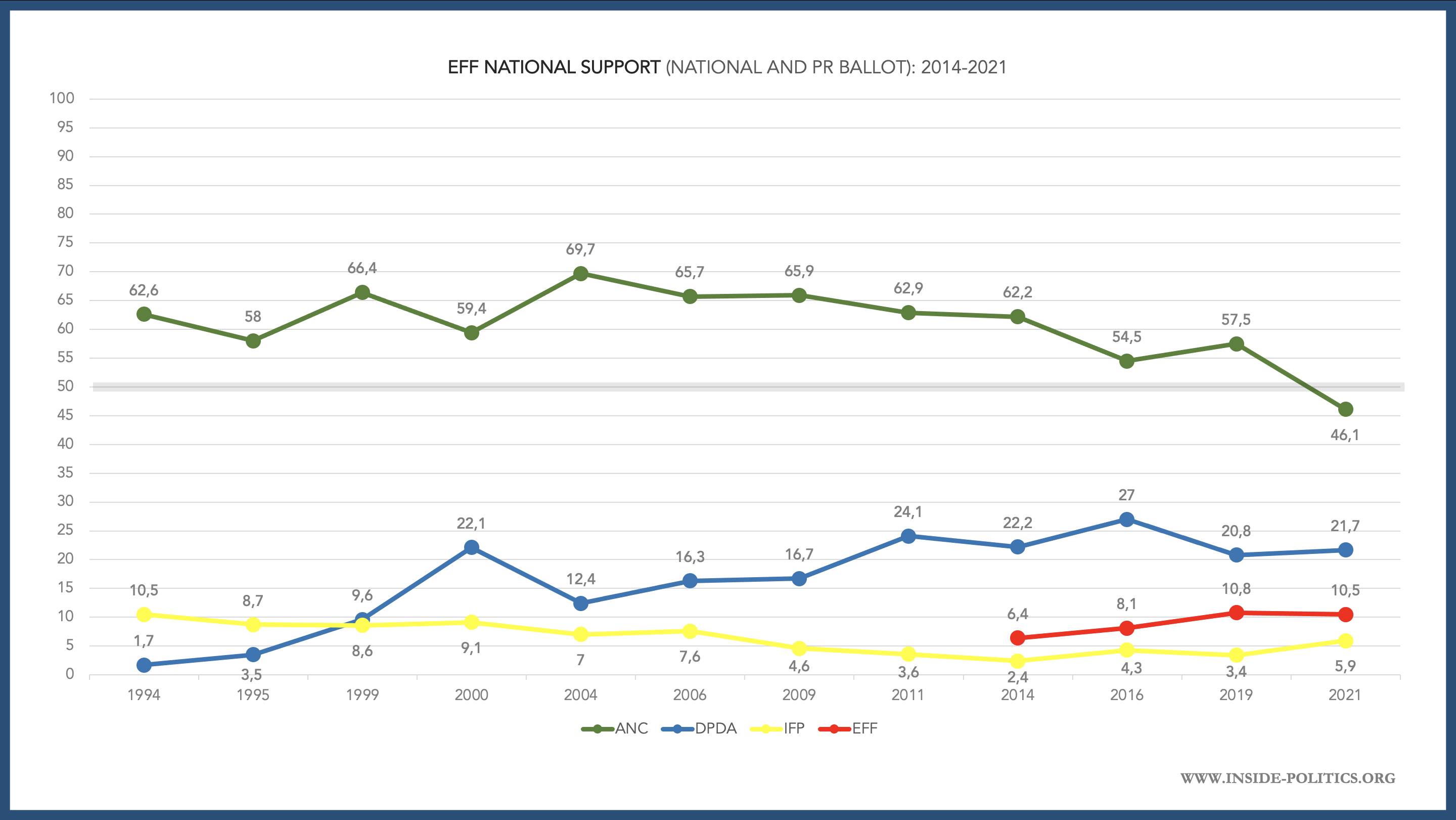 Essentially, the EFF grew between national elections (from 6.4% in 2014 to 10.5% in 2019) and grew, although to a lesser extent, between local government elections (from 8.1% in 2016 to 10.6% in 2021).