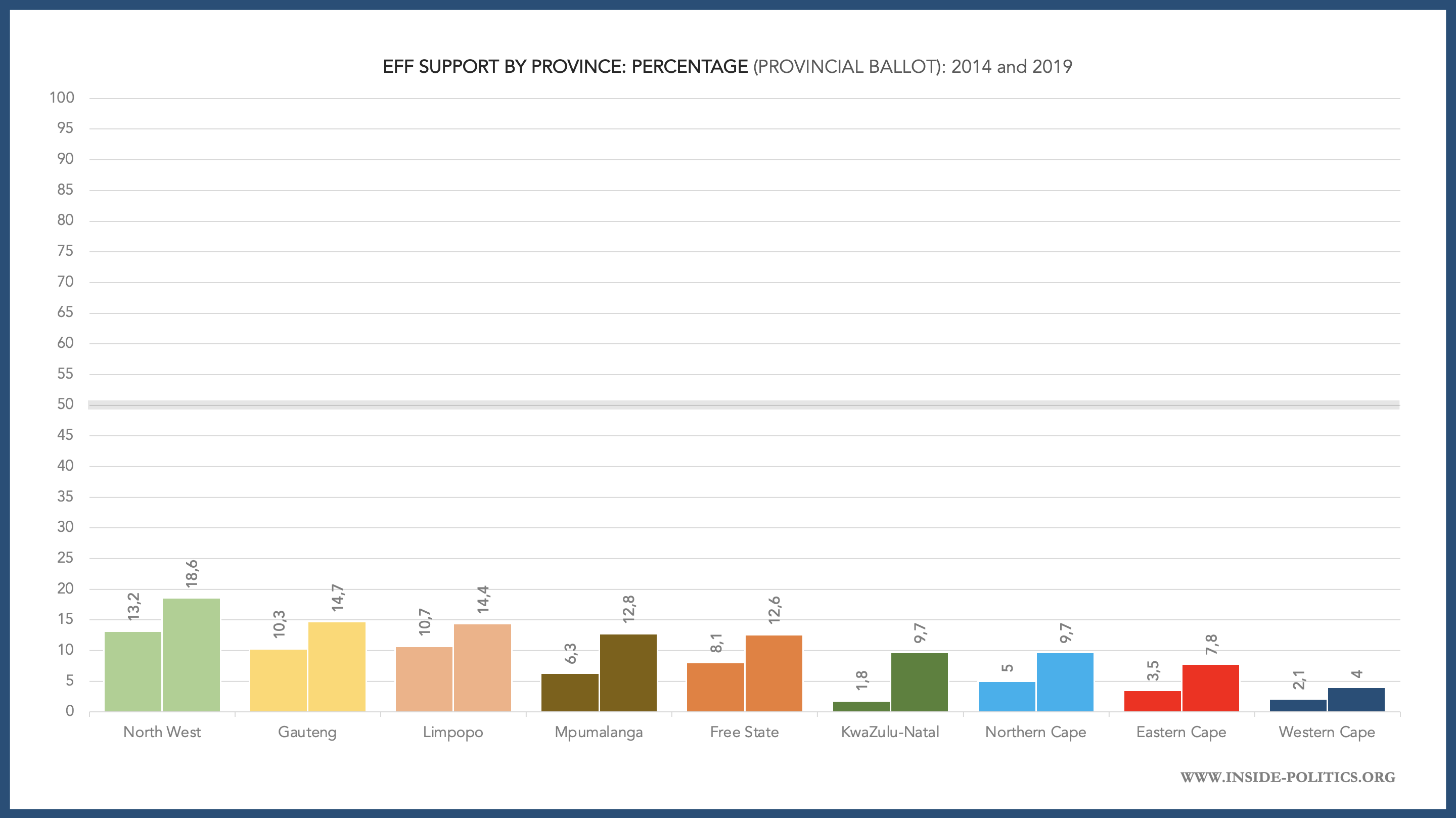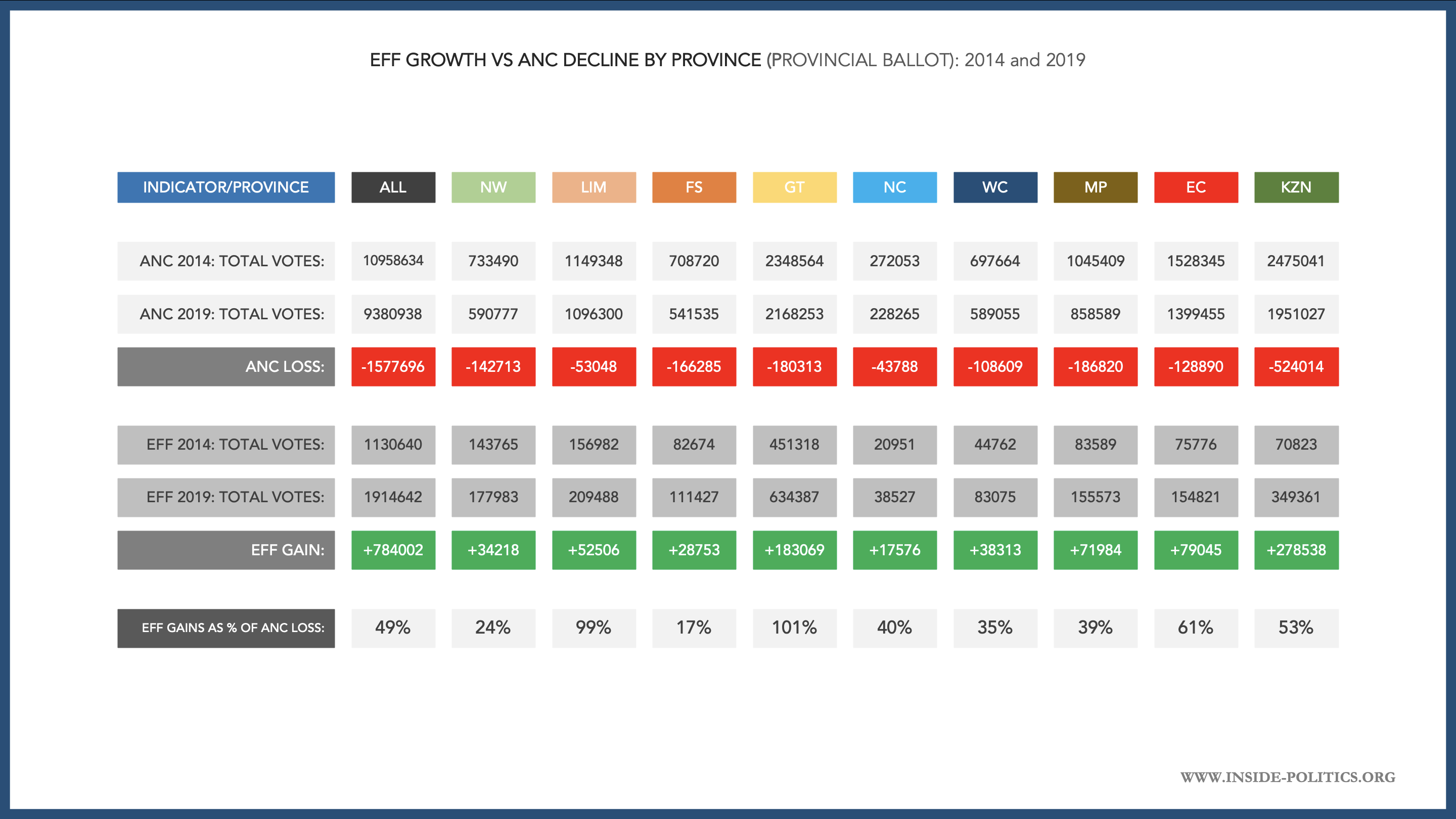 - Data on the EFF is limited, but it had a very successful 2019 election. It grew in absolute and percentage terms, both nationally and in every province.