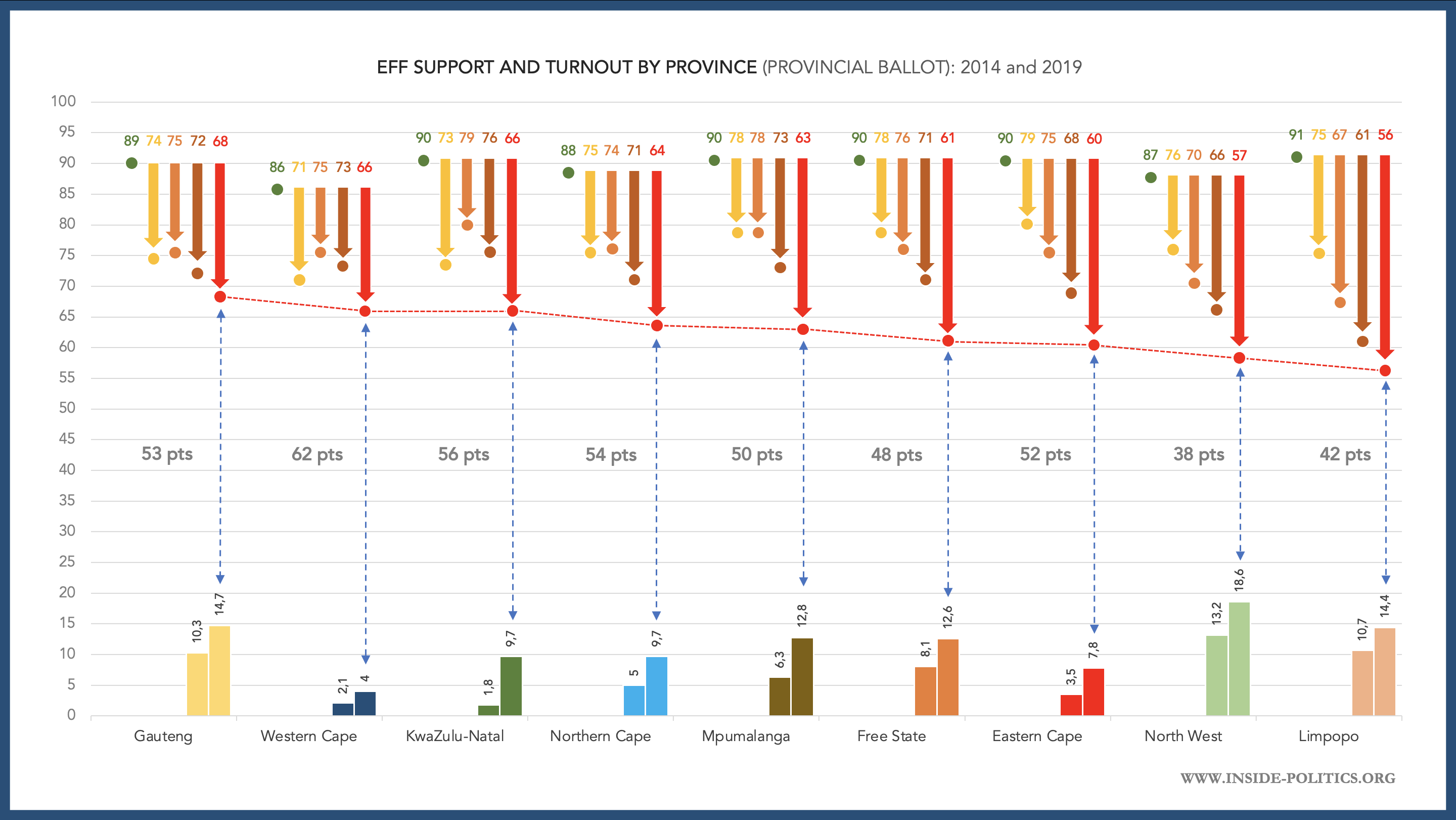 So, how did the EFF grow? One helpful comparative point is turnout. Below is a graphic that maps the EFF’s provincial support against provincial turnout.