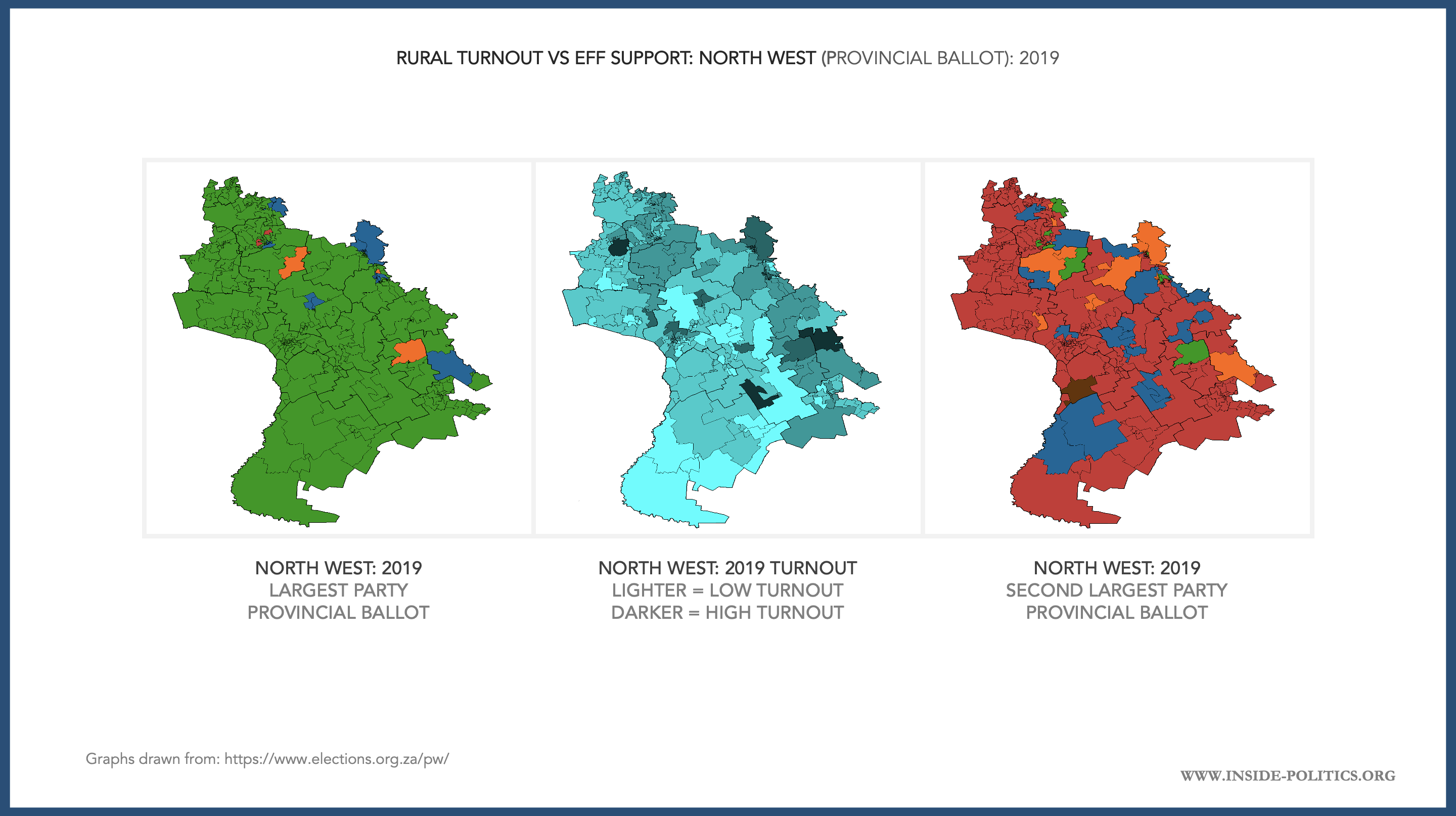 Let us start with the North West, below. The first set of maps shows 1. the ANC’s support in 2019 (green), 2. turnout (from light – low – to dark – high), and 3. the EFF’s support (red). Turnout is generally low, and the EFF’s support broad and overlapping with the ANC.