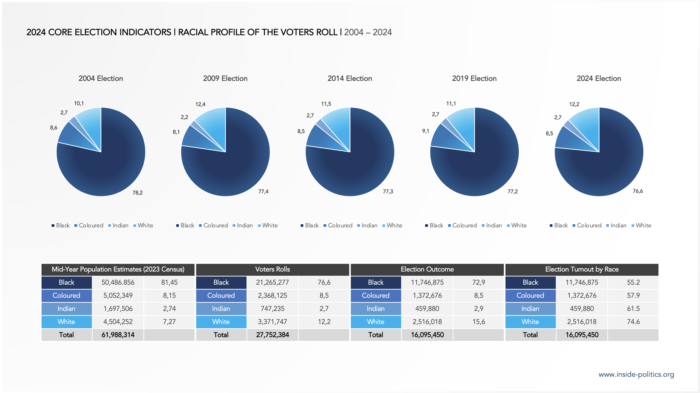 Of course the general population is not the voters roll, which is all that matters when it comes to party support and elections. The following graphic illustrates the racial profile of the Voters Roll for the 2004, 2009, 2014, 2019 and 2024 national and provincial elections, as well as some of the core indicators for the 2024 election.