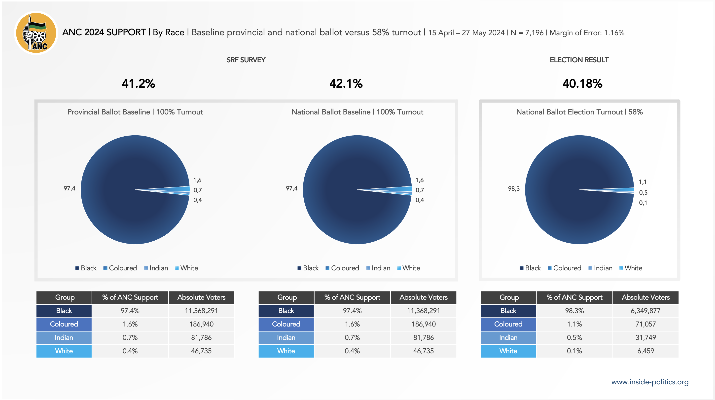 Like MK and the EFF, the ANC is essentially a racially homogenous organisation. On Election Day, 98.3% of its support came from Black South Africans. For MK, 99.4% and for the EFF, 97.6%. There is no substantive difference in the baseline support (100% turnout) for these parties either: ANC: 97.4%, MK: 99.3% and EFF: 97.2% (national ballot). There is also virtually no difference between support for these parties provincially or nationally: their support by race remains almost identical.