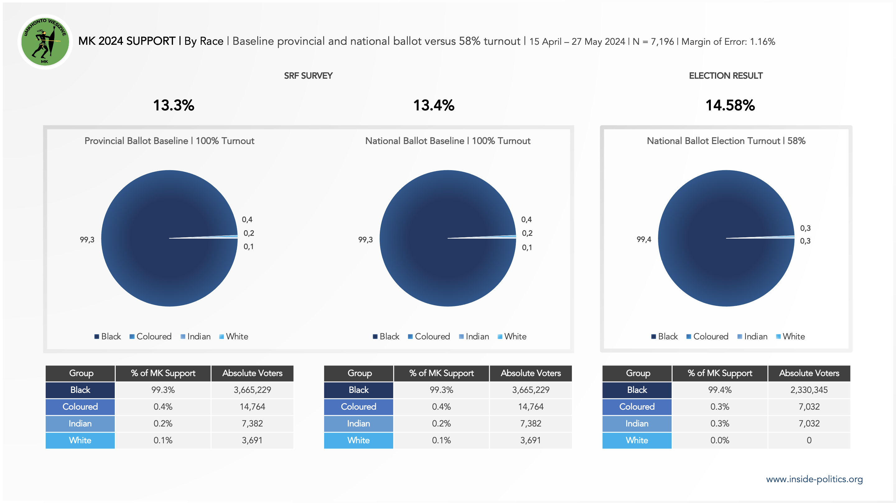 The DA had a substantial problem turning out its baseline Coloured support but was exceptionally strong among White voters (89.3%) and strong among Indian voters (63.5%). The ANC, MK and the EFF all failed to turnout what miniscule minority support they had, in every case resulting in their final percentage of Black support increasing as a proportion of their total vote share.