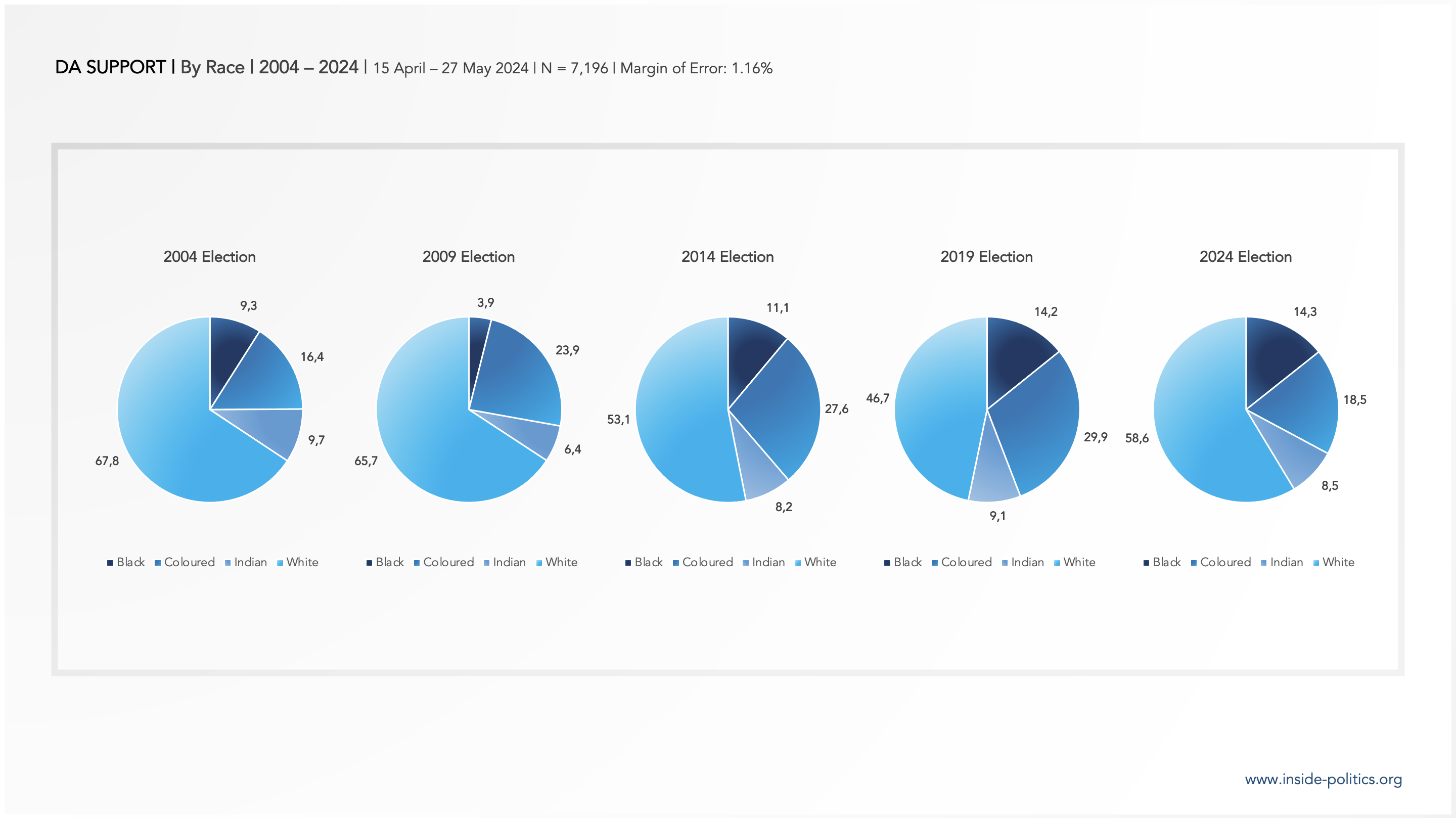 Between 2004 and 2019, the percentage of White voters, as a proportion of the DA’s total vote share systematically shrank – from 67.8%, to 65.7%, to 53.1%, to 46.7%. In 2024 it grew again, to 58.6%. It’s percentage of Black support has grown over the same period, from 9.3% in 2004, to 11.1% in 2014, to approximately 14% in 2019 and 2024.