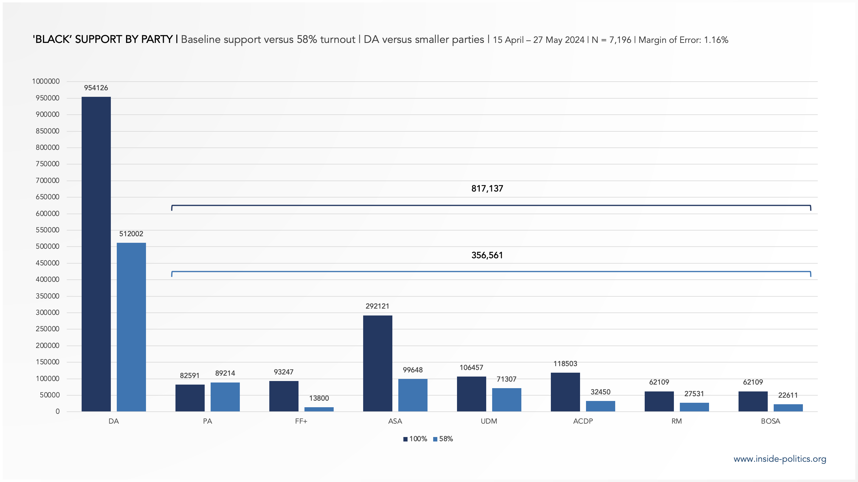 In July 2022, the DA was on 25.1% among registered voters, in term of baseline support. 31.8% of that support came from Black South Africans (or approximately 2,020,201 voters). In March 2023, it was on 23.4% and 28.2% of that support came from Black South Africans (approximately 1,807,548 voters). In September 2023 its baseline support was 28.6% and 43.2% of that support came from Black South Africans (approximately 3,423,709 voters). Yet by the time the Election came, its baseline black support had dropped to 18% (956,937) and on Election Day, 14.3% (502,696).