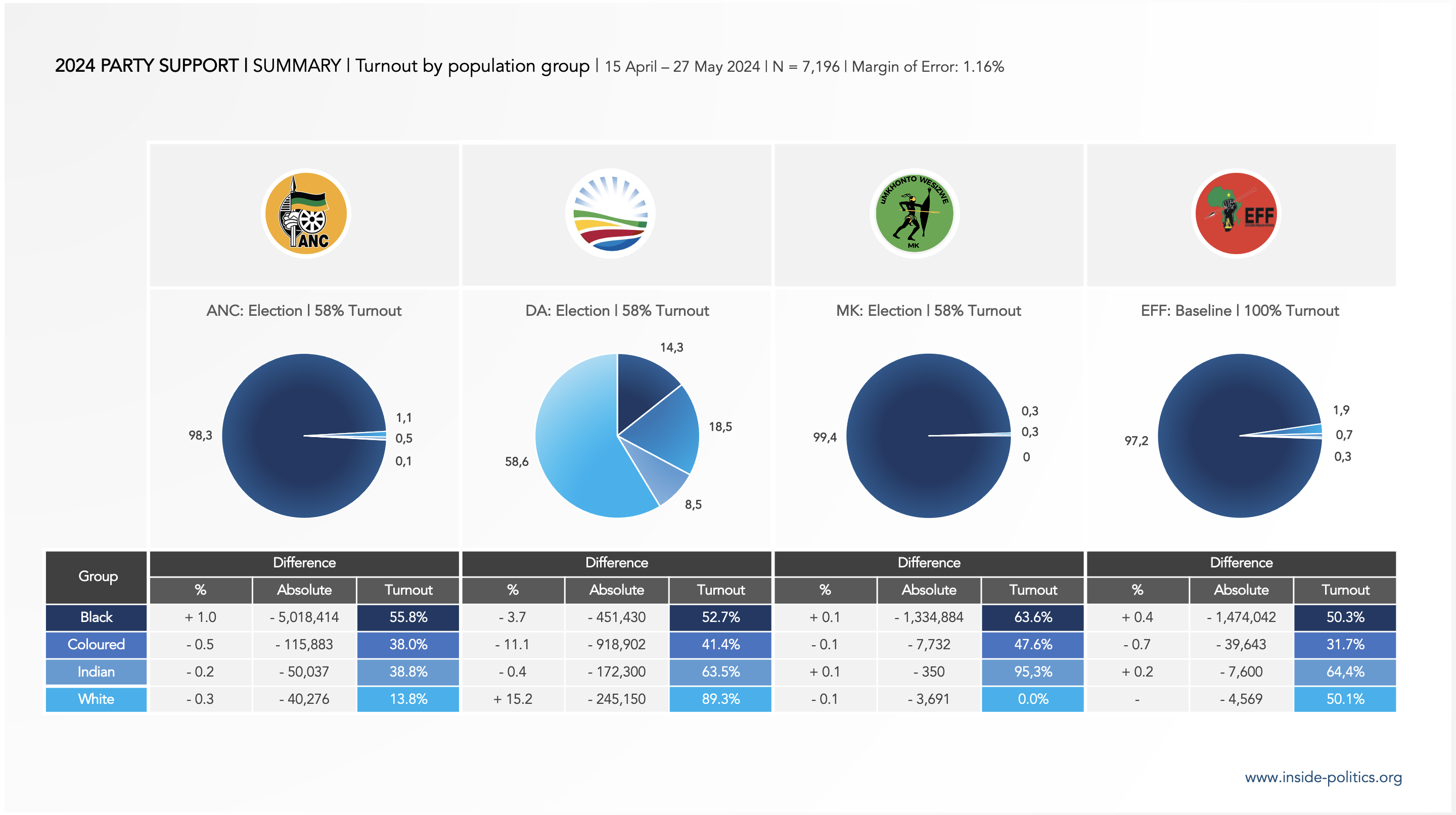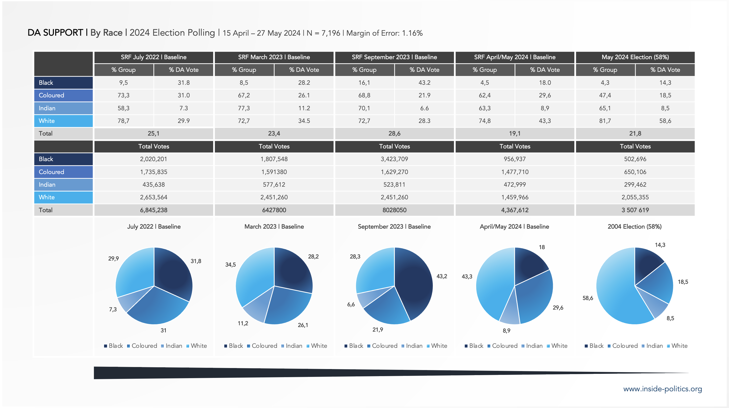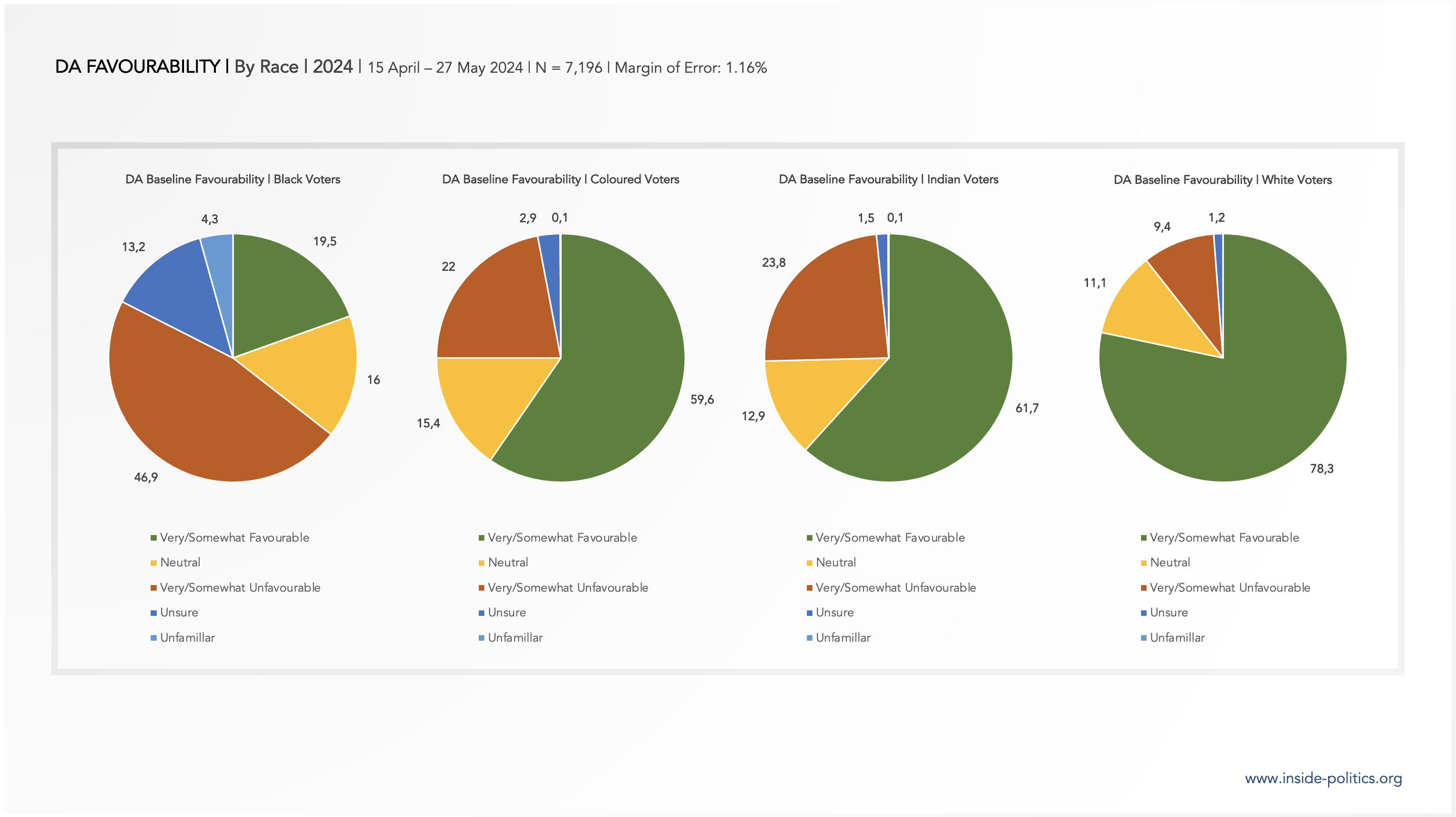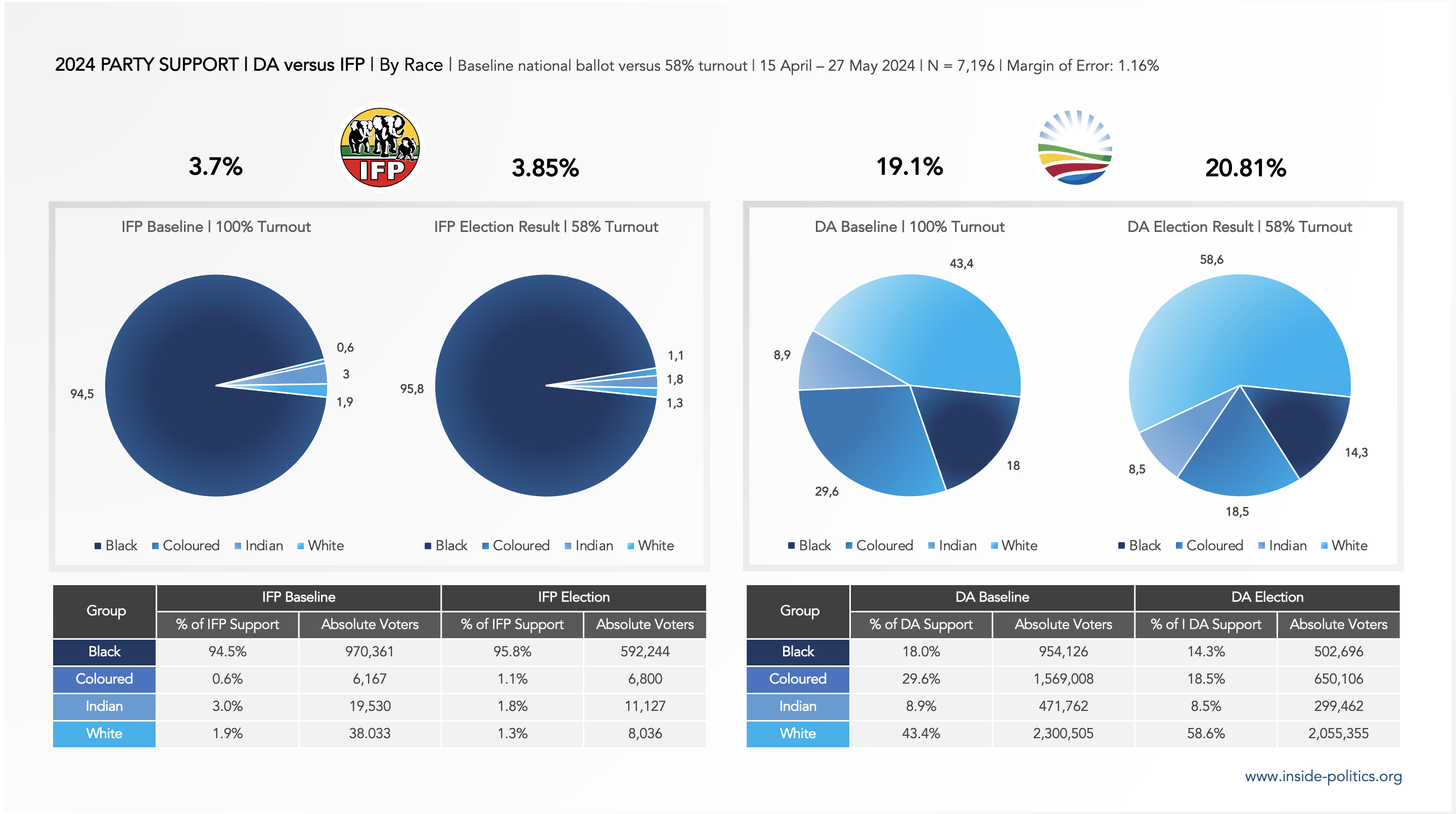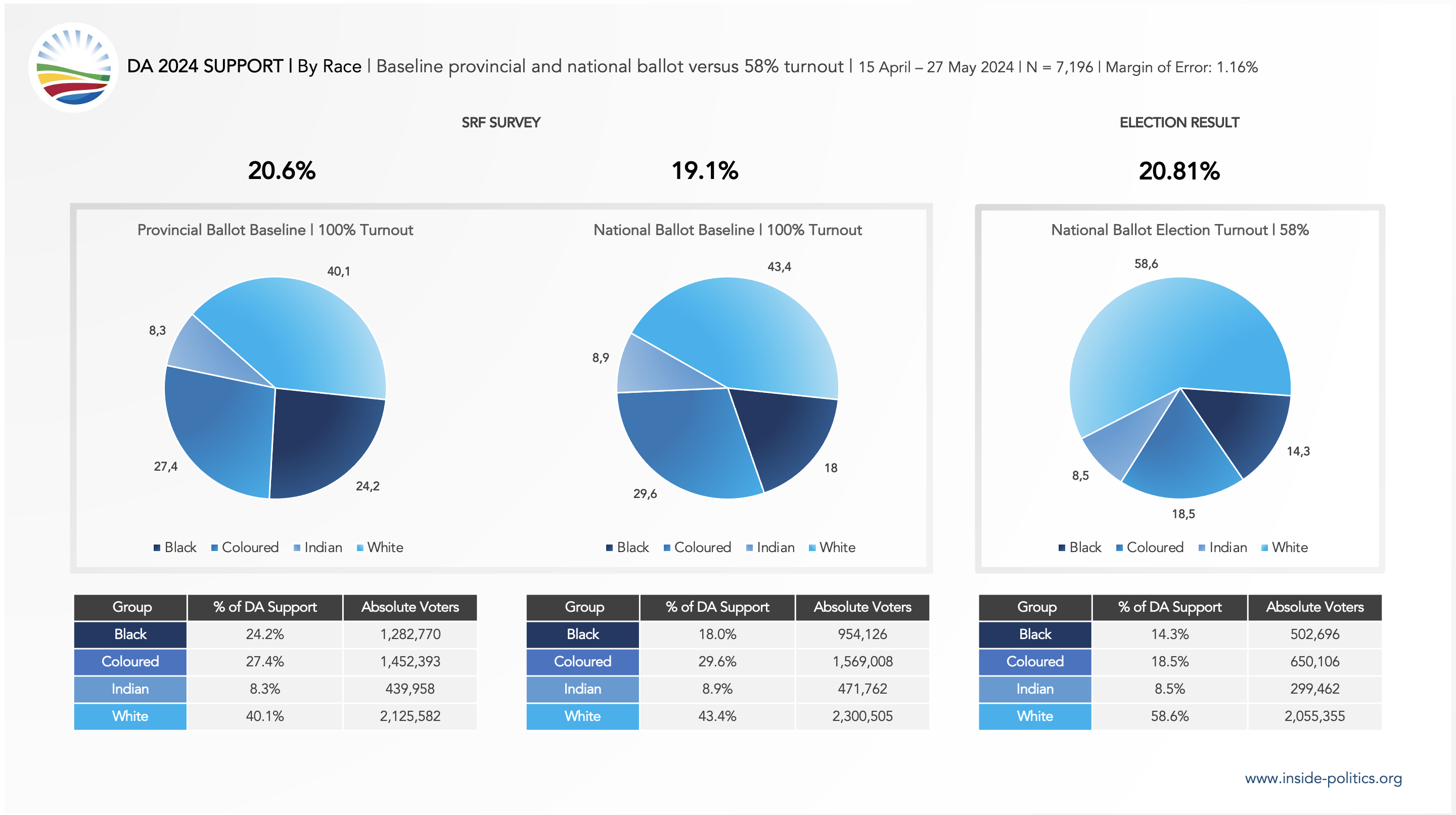 - In terms of its baseline support, White DA voters are in a minority: 56.5% of DA base support comes from Coloured, Indian and Black Voters.