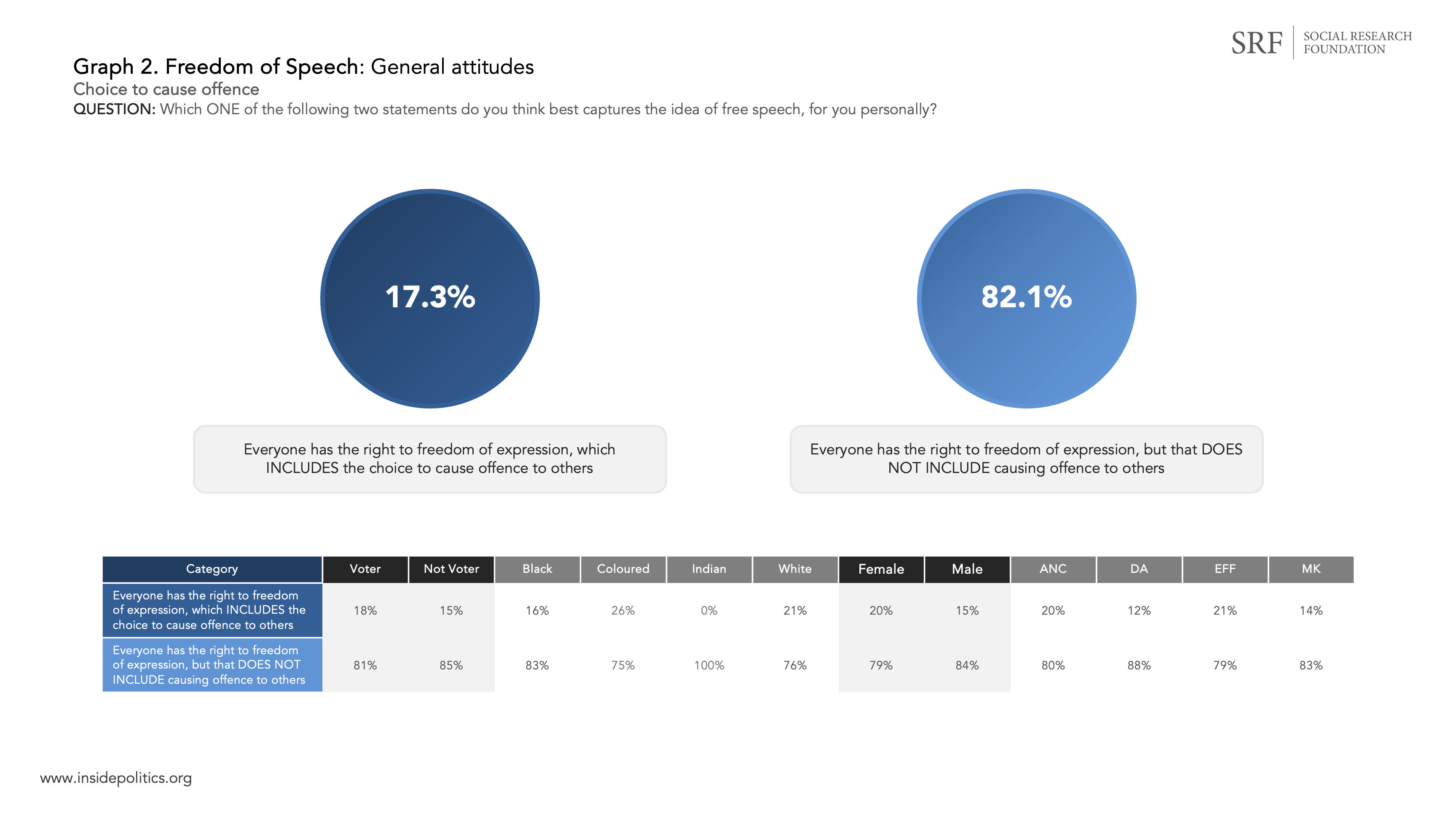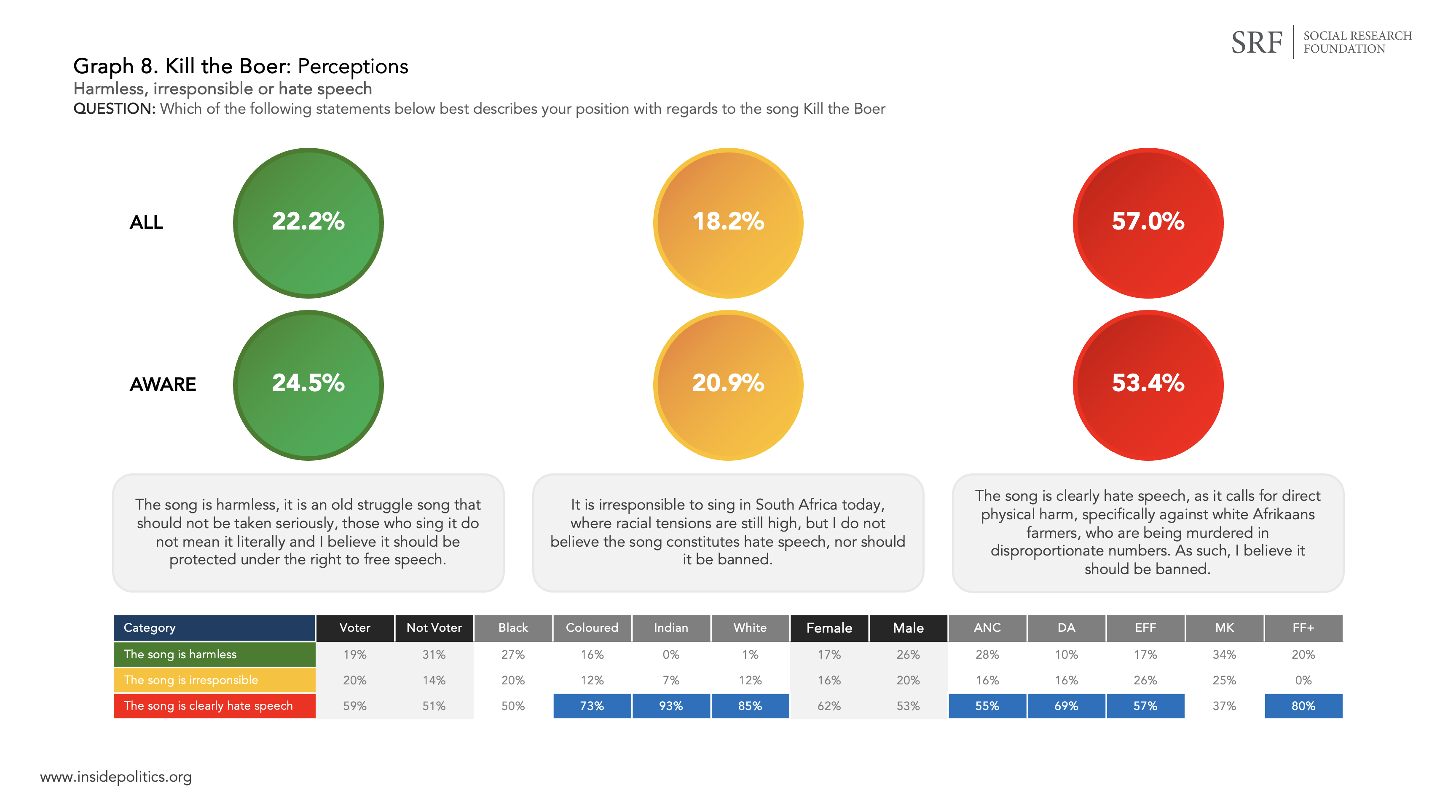The Social Research Foundation (SRF) recently commissioned a short, nationally representative survey on public perceptions around free speech, hate speech and the song Kill the Boer. The survey was conducted by Victory Research (of which I am the CEO). The SRF was kind enough to let me set out the findings. What follows is a summary of the key insights. In setting them out, I will focus more on the ‘what’ than the ‘why’.