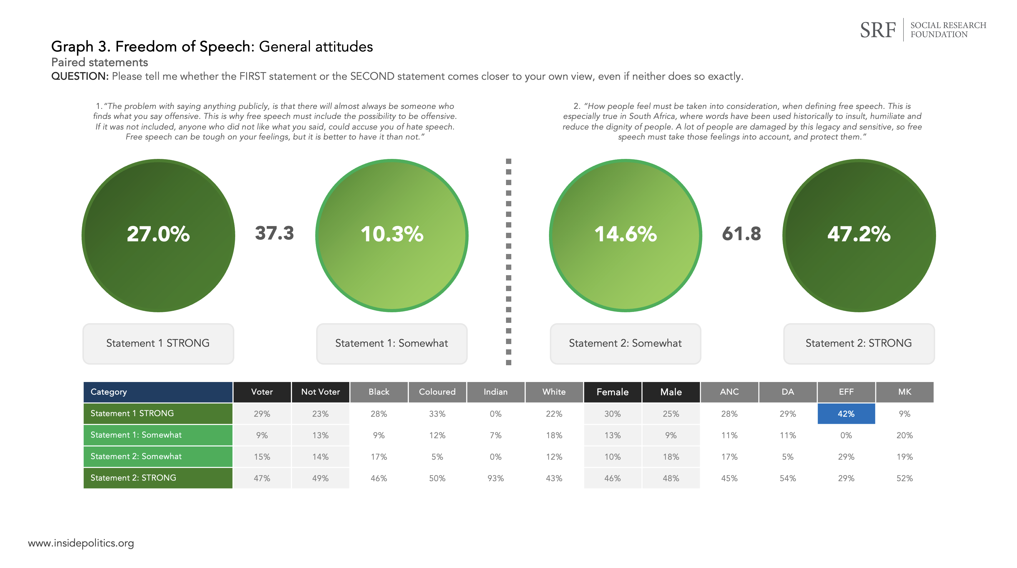 Graph 3 (below) takes this interrogation a little further, by asking respondents to think more carefully about the idea of offence and what it entails. They were presented with two opposing ideas and asked to choose which one came closer to their understanding. Statement 1 argued offence must be covered by free speech, or no one would be allowed to say anything. Statement 2 argued that feelings are all important, especially given our history, and free speech must protect feelings.