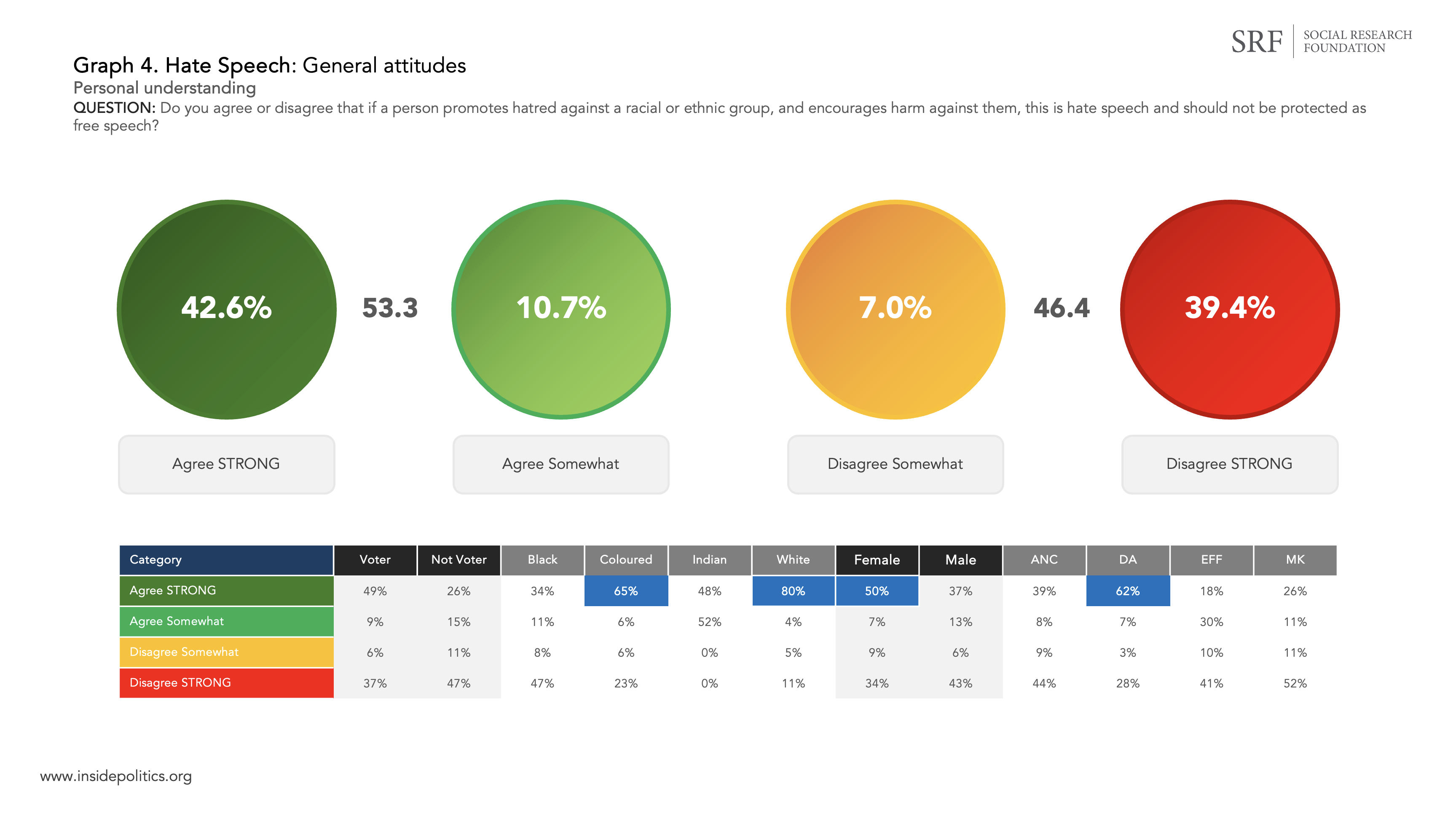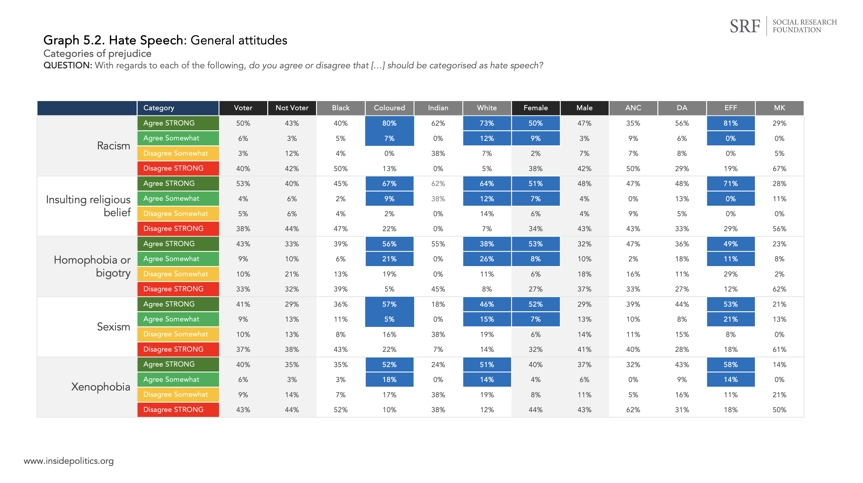 There was strong agreement that most should be categorised as hate speech among Coloured and White South Africans. Females were also generally more on board each idea being categorised as hate speech compared to males. And, among the four biggest political parties, the strongest agreement that each term be categorised as hate speech was among EFF supporters.