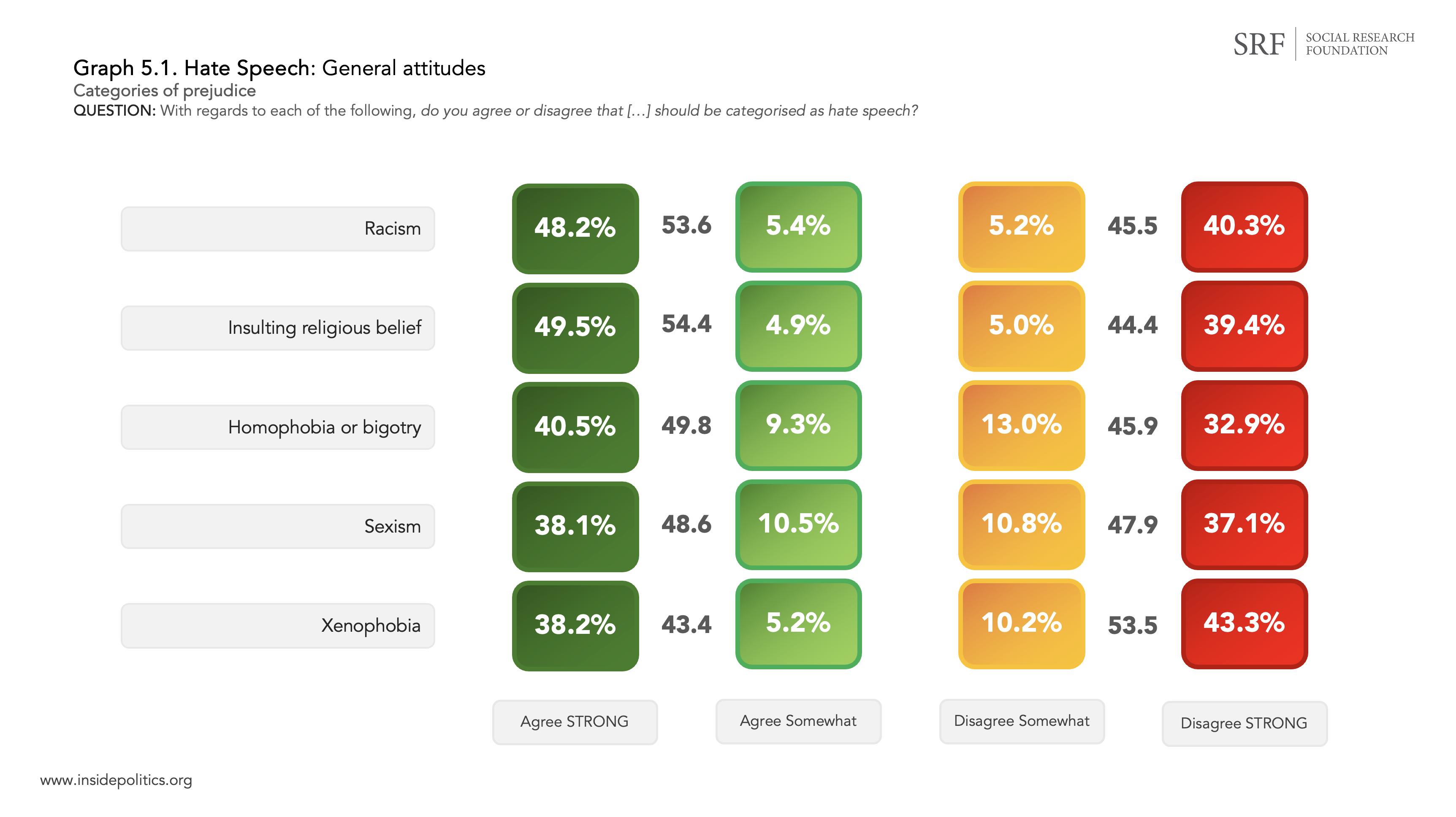 - Censorship: (the responses “To take steps to get them banned or censored from speaking publicly”; “To approach their employer, if they are employed, to act against them” and “To ask the government or a state institution like the HRC to investigate them”)