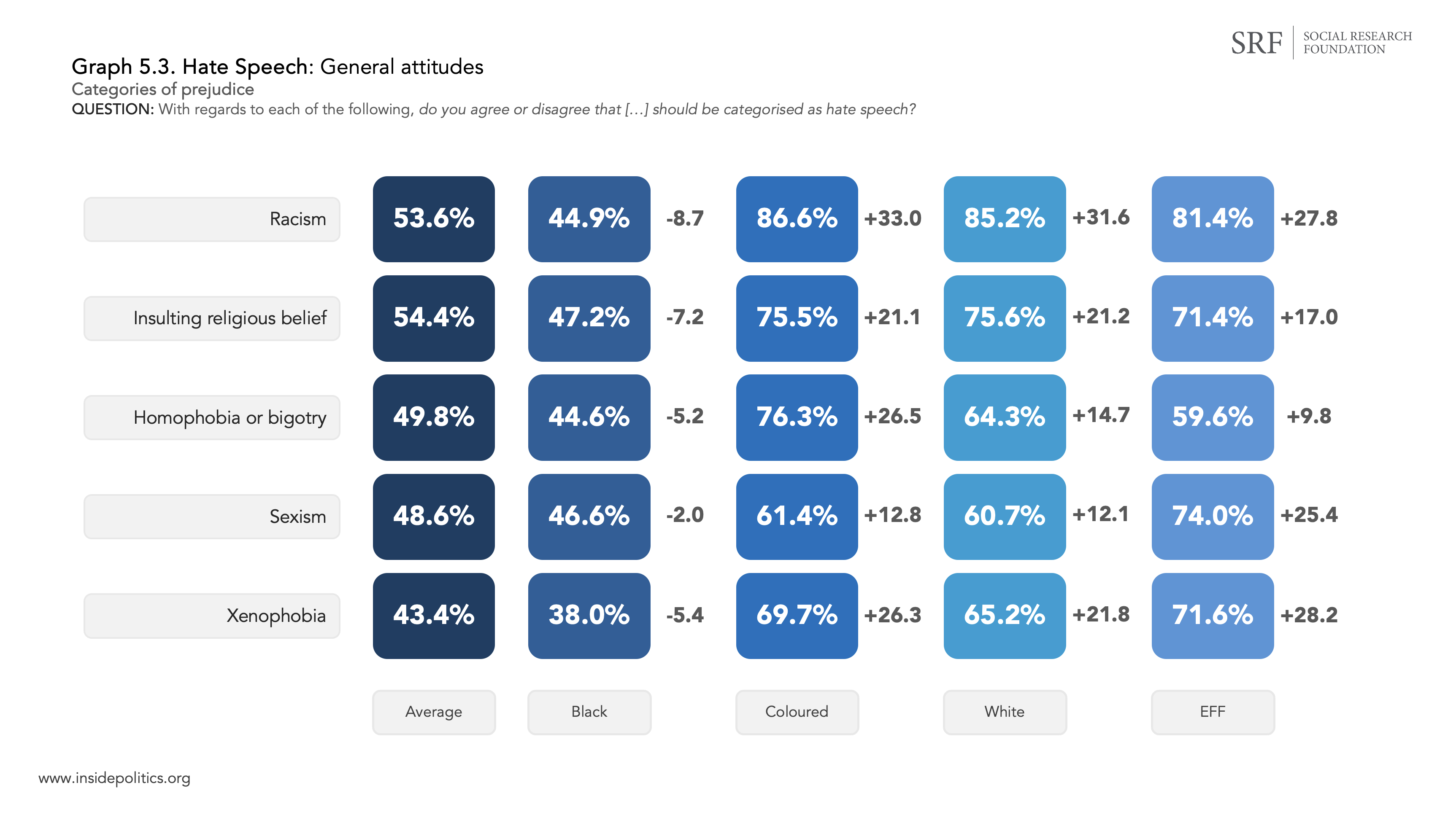 There are substantial differentials between most of them. For example: “Racism”. Among all respondents, 53.6% agreed it should be categorised as hate speech. This was largely driven by White (85.2%) and Coloured (86.6%) minorities, both scores being significantly above Black respondents (44.9%). This trend holds for all examples.