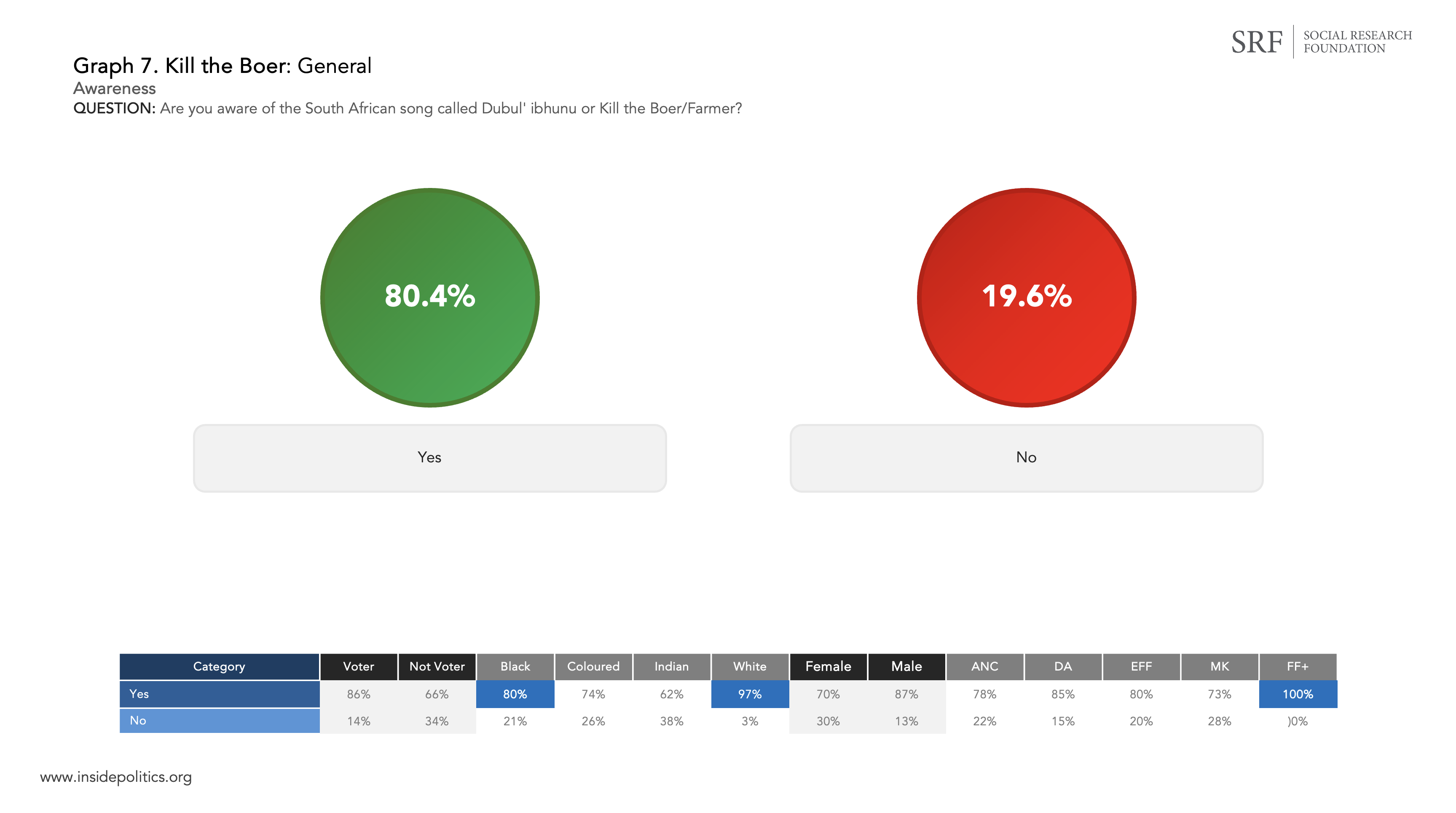 Moving onto the song Kill the Boer. Graph 7 (below) establishes who was aware of the song. I have added the Freedom Front + (FF+) to the cross tabulations here, as it is an important constituency on this issue.