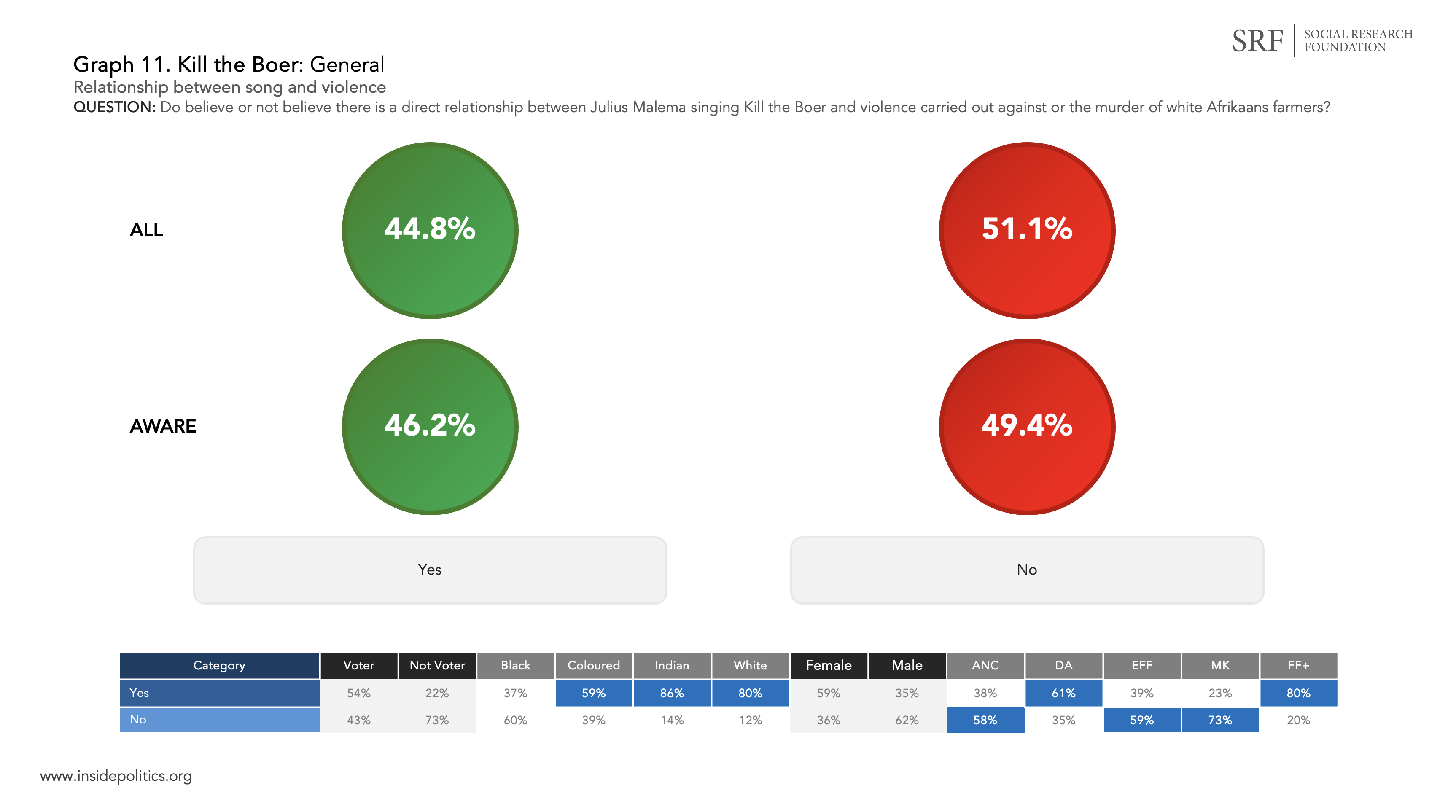 Graph 11 (below) measures whether people believe there is a direct relationship between Malema’s singing of the song and violence carried out against white Afrikaner farmers.