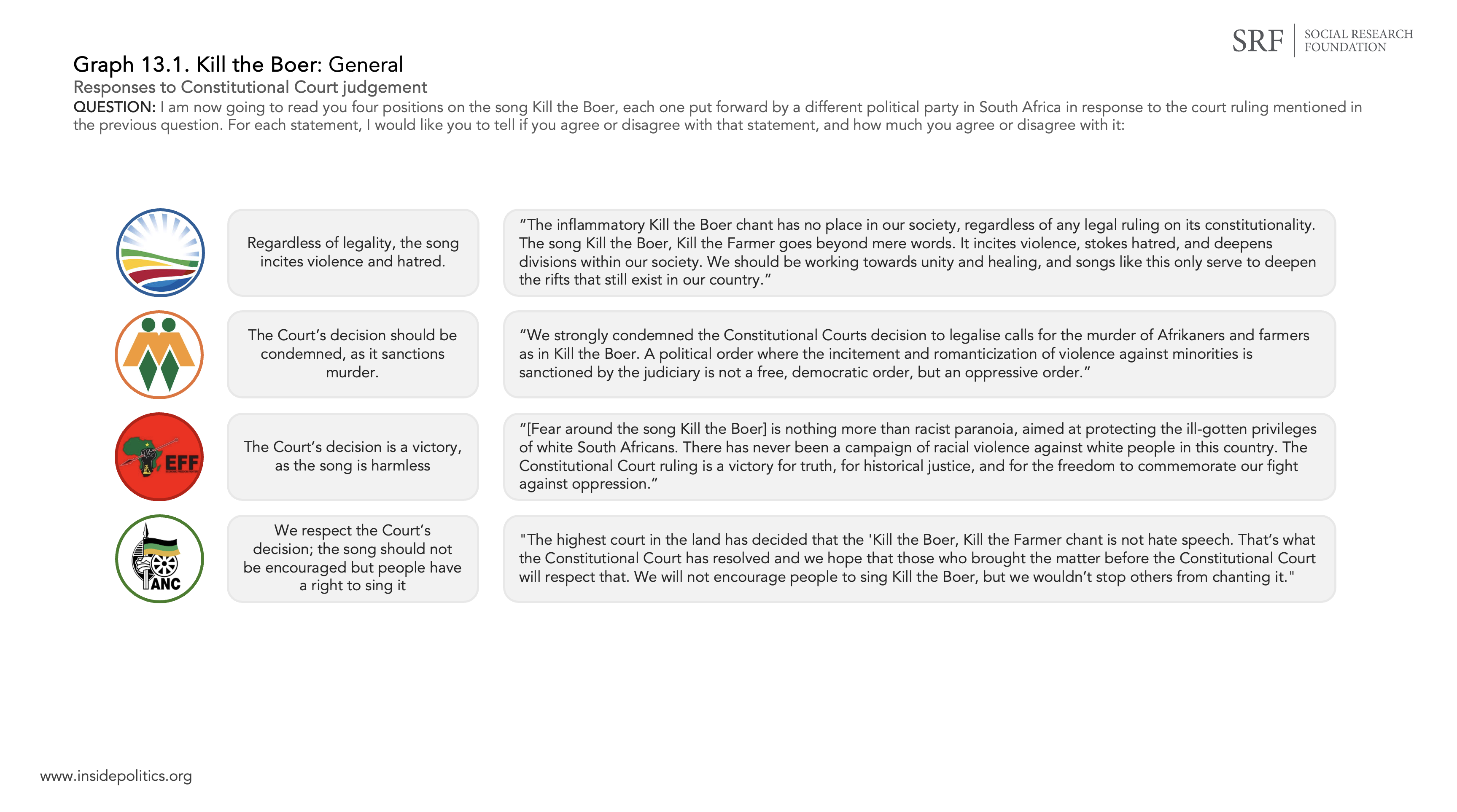 The most recent of these judgments came from the Constitutional Court, which dismissed AfriForum’s appeal against an earlier ruling (which found the song did not constitute hate speech). The final set of graphs (13.1, 13.2 and 13.3 below) deal with the official responses of four political parties or organisations to this judgement (the DA, AfriForum, EFF and ANC).