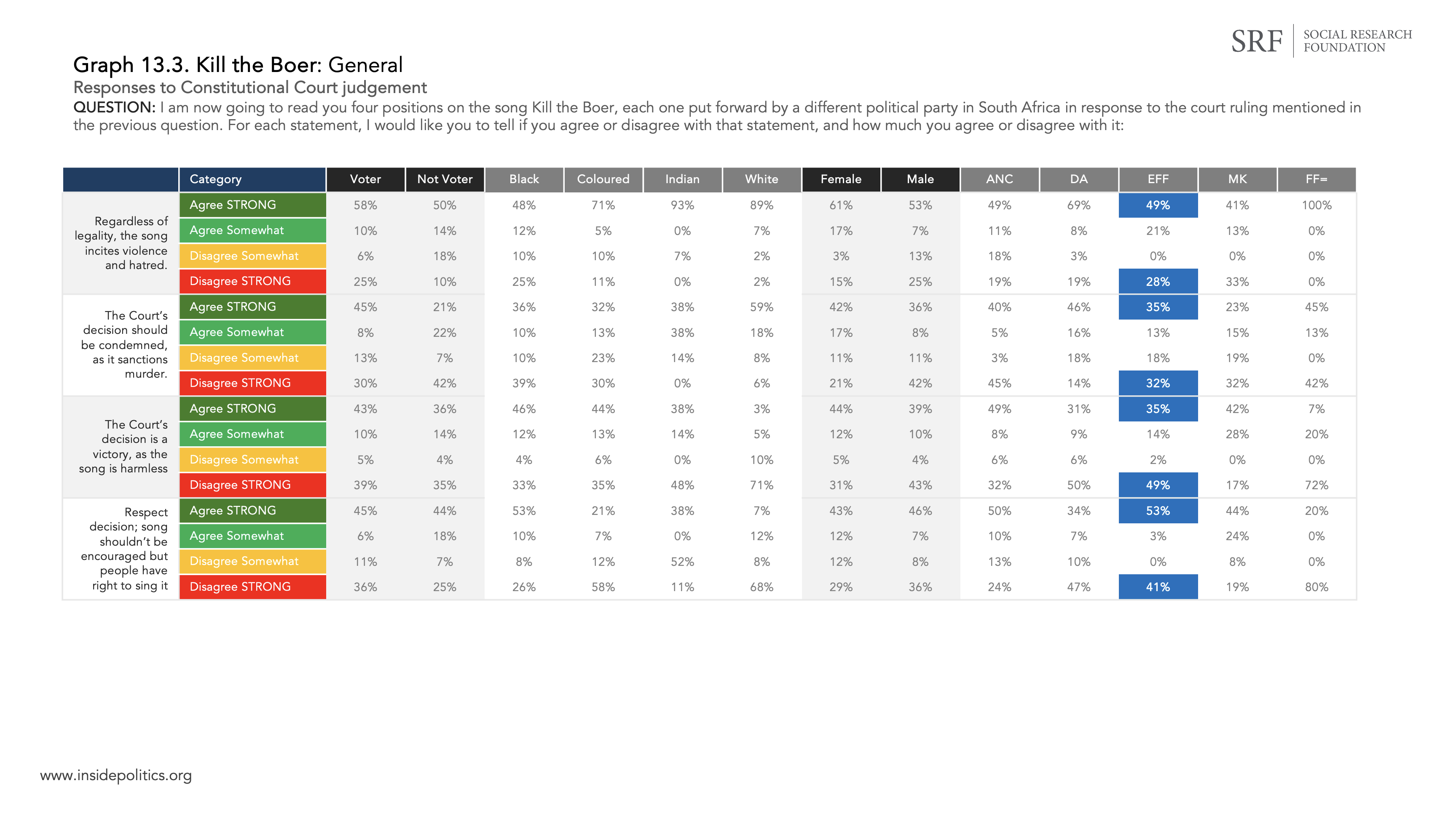 Significantly, 57% of EFF supporters identified the song as “clearly hate speech”. A further 26% said singing the song was “irresponsible”. So a total of 83% of EFF supporters felt the song irresponsible or hate speech. That is a remarkable finding.