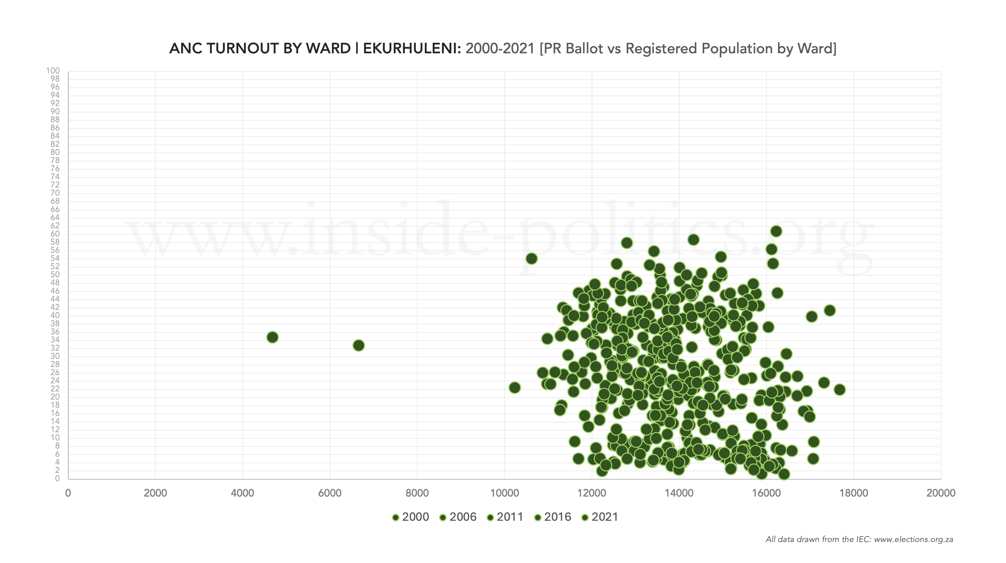 Each metro has five scatter graphs that shows ANC or DA turnout by ward for each local government election year, as well as one combined scatter graph upfront, which shows all years. At the end, there is a timelapse video of all six graphs, which helps identify movement patterns.