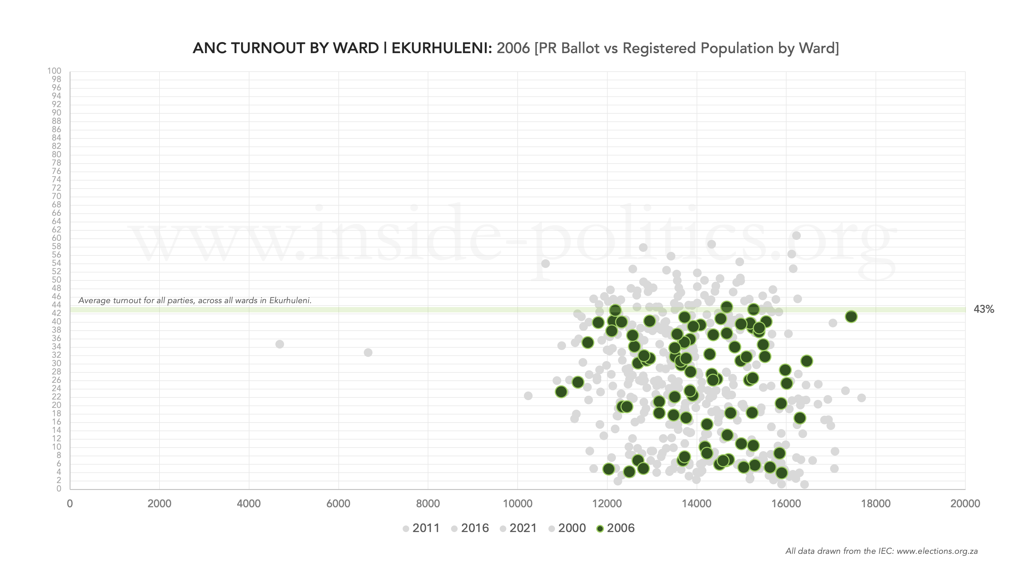 Each dot represents a ward and is calculated by dividing either the ANC’s or DA’s total valid PR votes in that ward, by the total registered voting population in that ward. I have also included a line in each graph, to demonstrate where the general turnout average across all parties was in the metro, for a given year.
