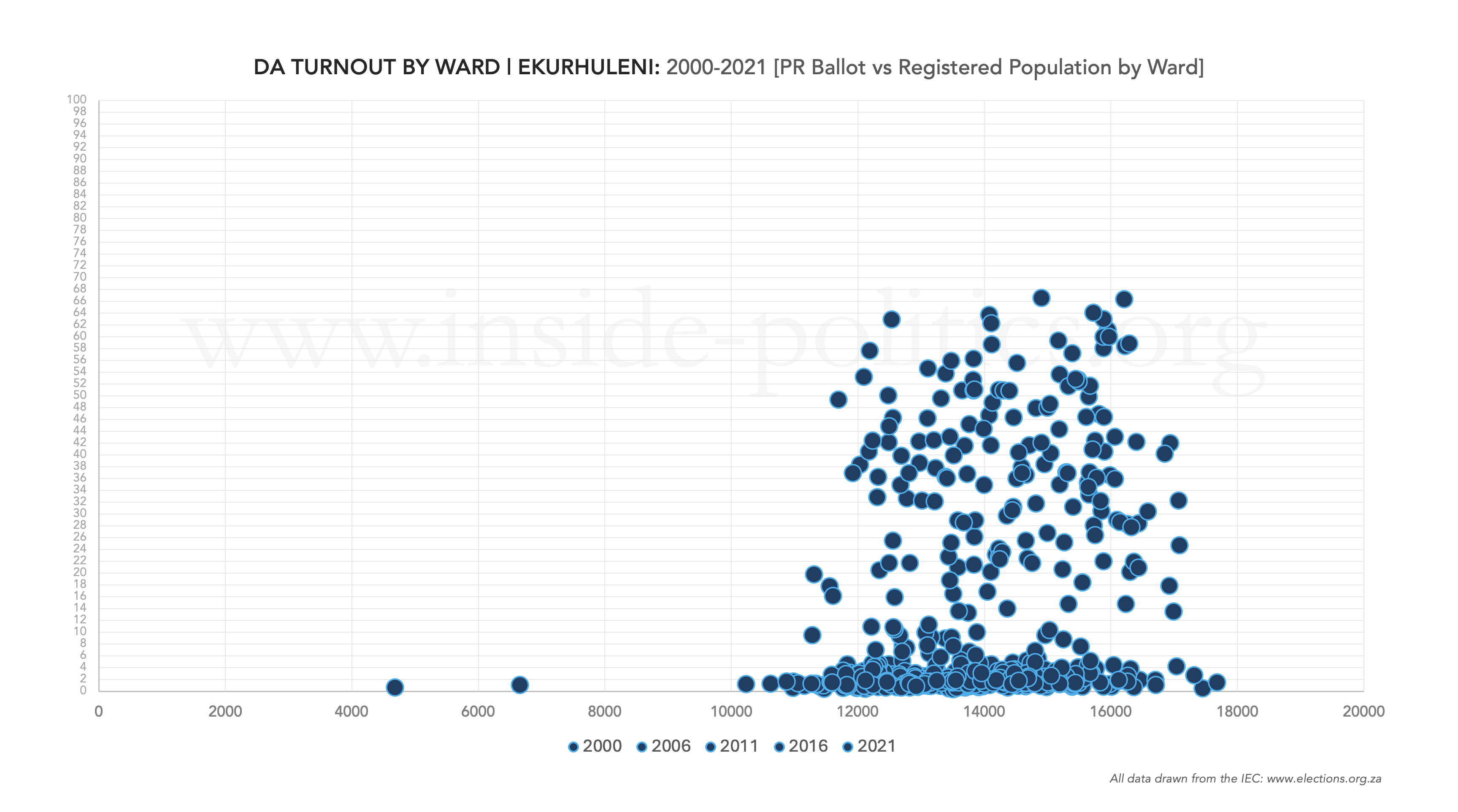 The ANC’s and DA’s turnout percentage runs up the Y-axis, and the size of the ward (in terms of registered voters) runs along the X-axis. So, what you want as a political party are dots up and towards the right-hand corner (big ward/high turnout).