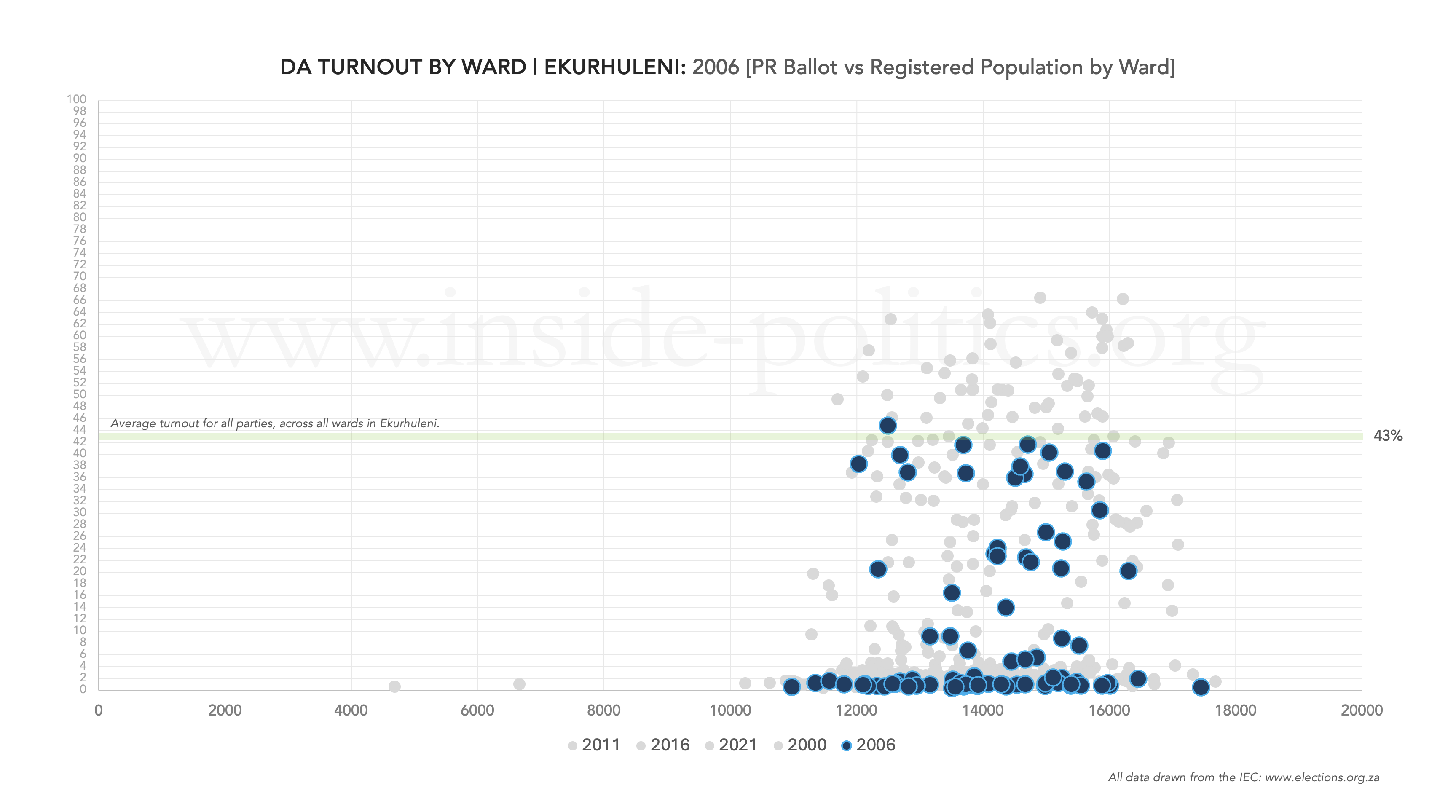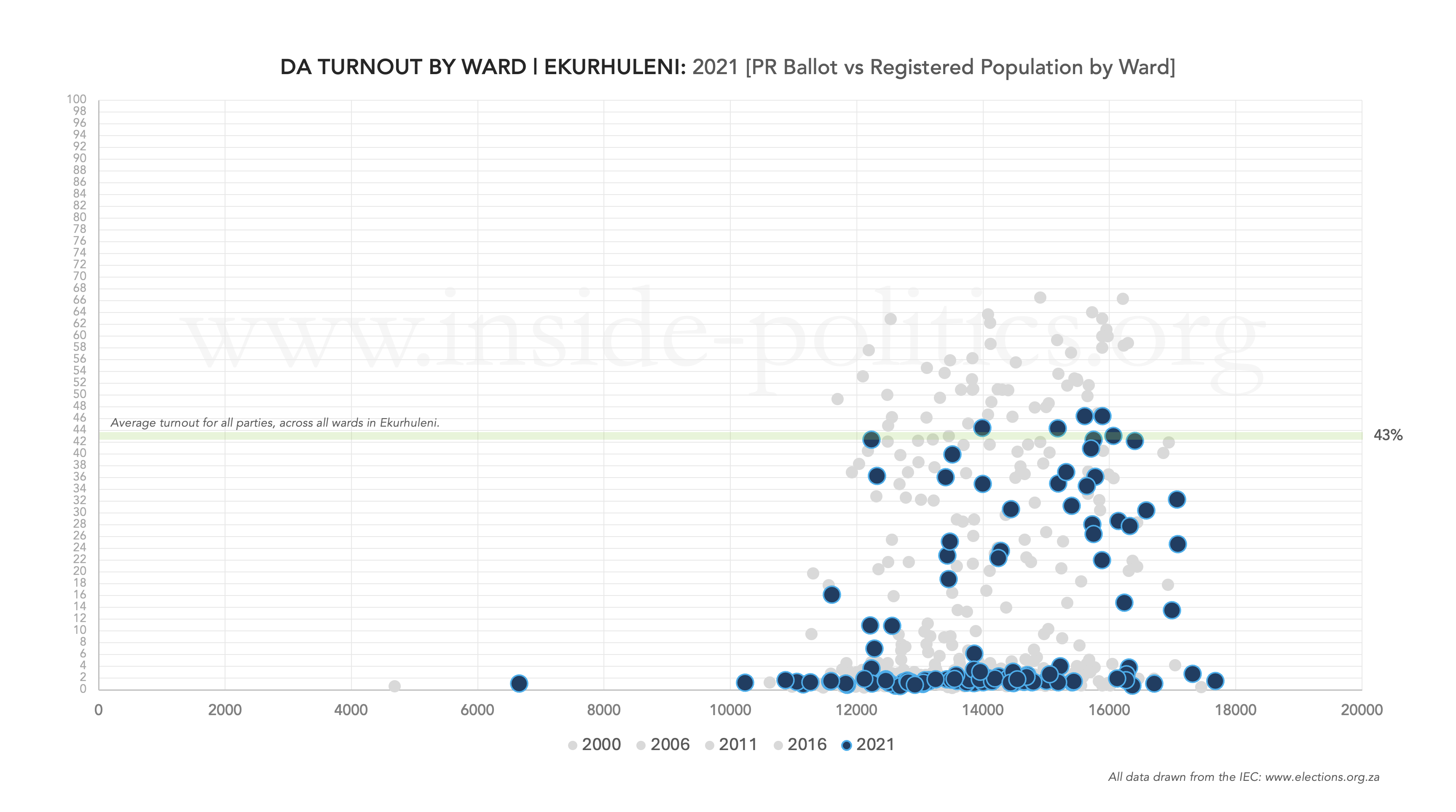 Each dot represents a ward and is calculated by dividing either the ANC’s or DA’s total valid PR votes in that ward, by the total registered voting population in that ward. I have also included a line in each graph, to demonstrate where the general turnout average across all parties was in the metro, for a given year.