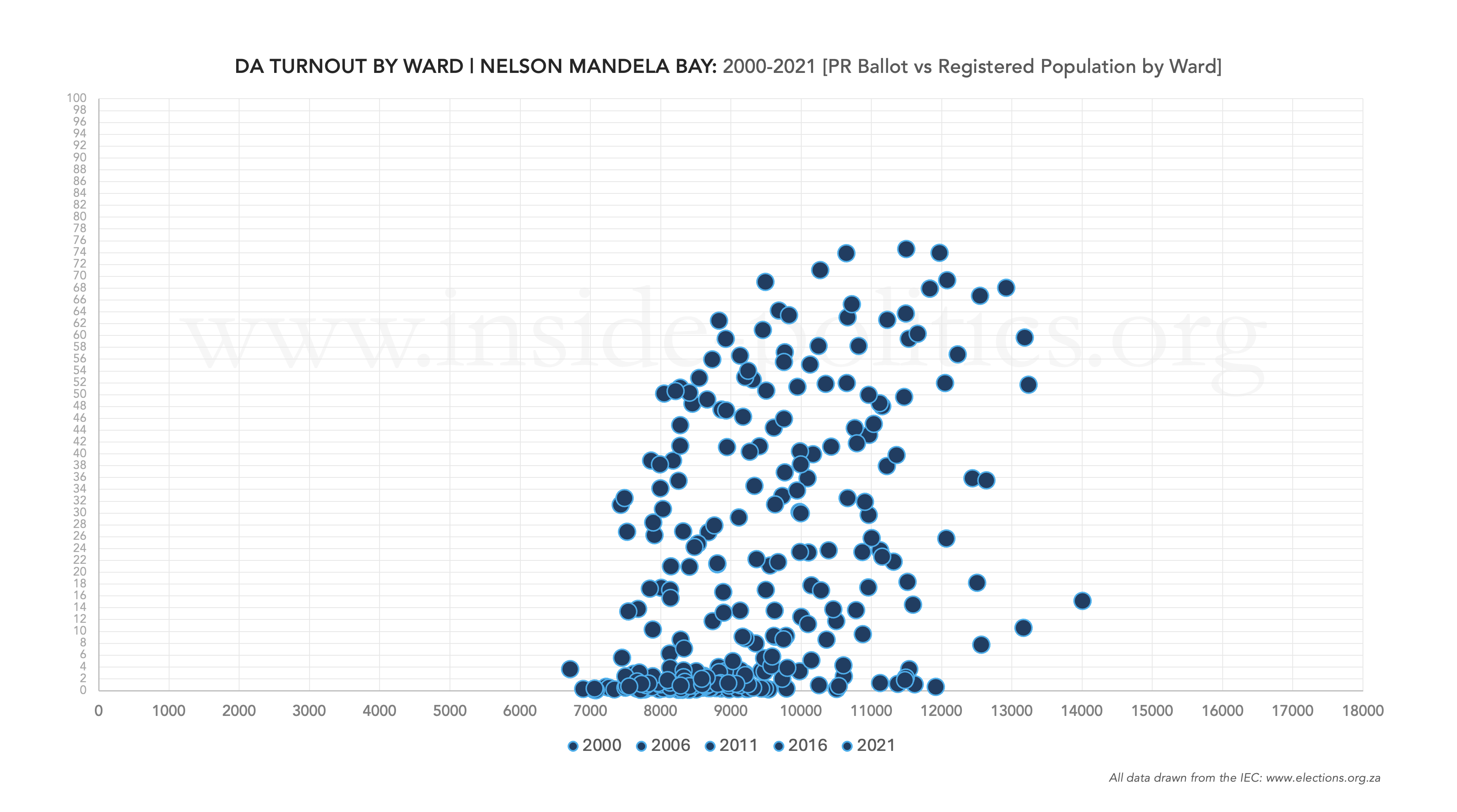 Each metro has five scatter graphs that shows ANC or DA turnout by ward for each local government election year, as well as one combined scatter graph upfront, which shows all years. At the end, there is a timelapse video of all six graphs, which helps identify movement patterns.