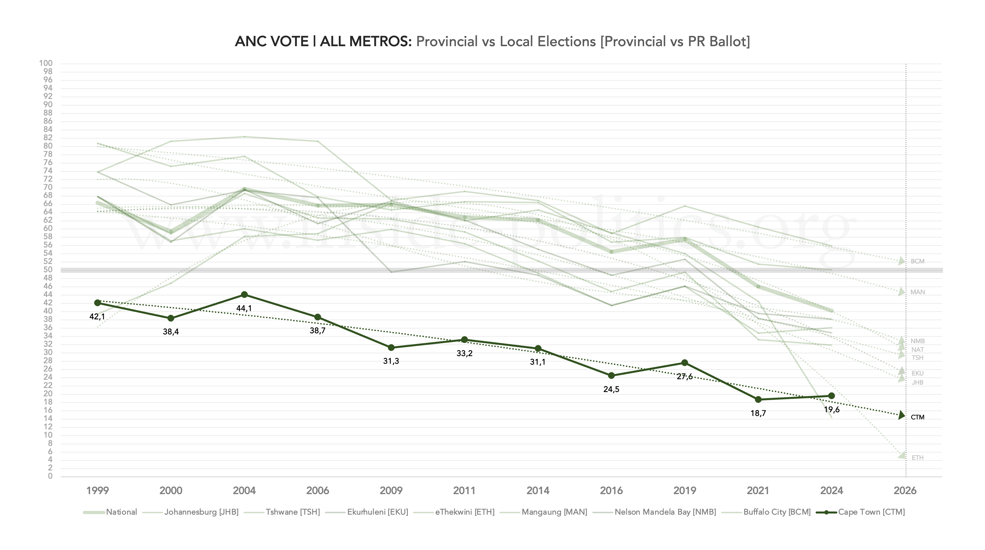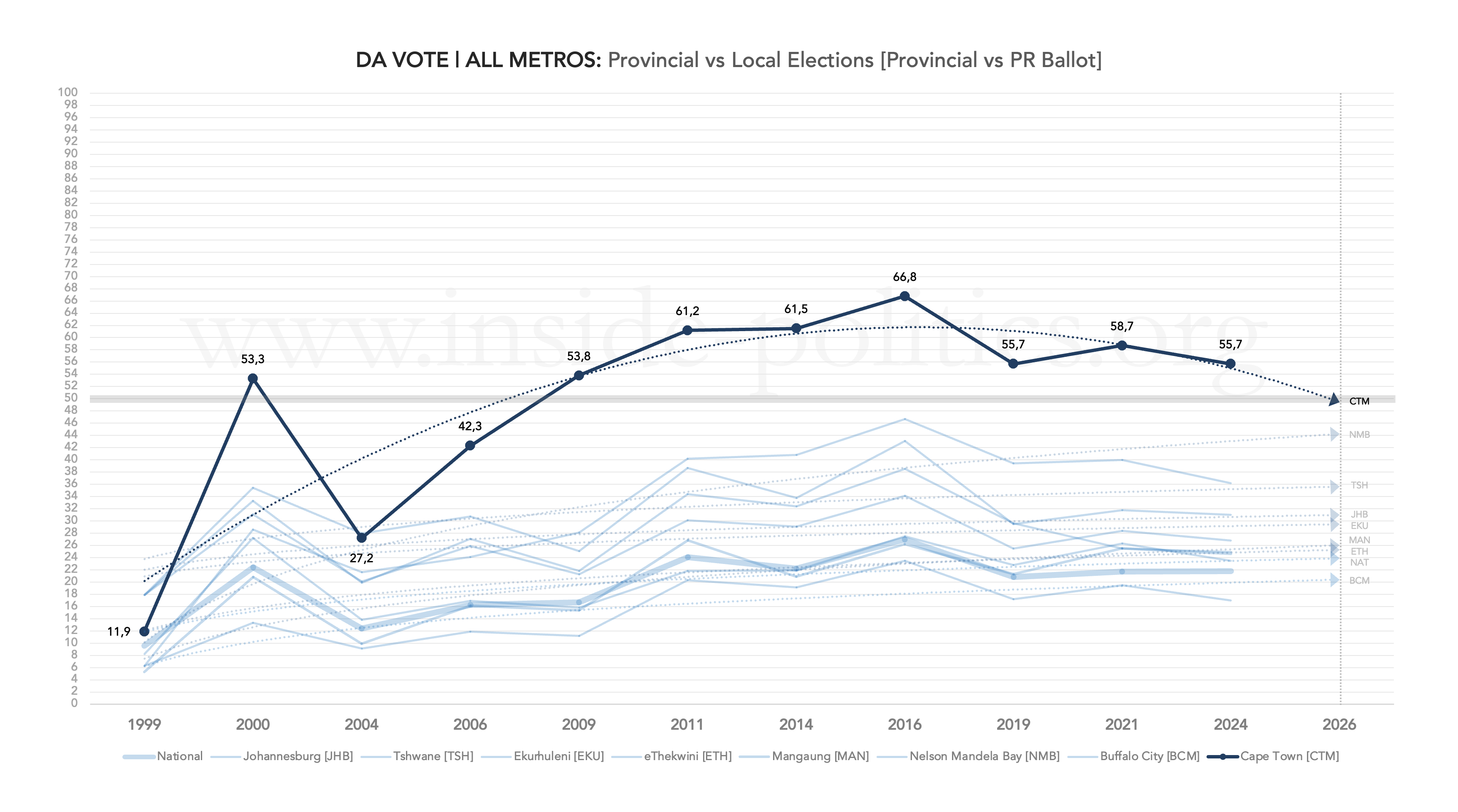 Again, this would suggest a 2026/7 DA result closer to 55% (what it got in 2024) or above, and the ANC would do well to stay above 15%. It is also worth noting that comparisons with the ANC in Cape Town are becoming less and less valuable over time, given how small the party has become. They are repeated here simply for consistency with the other metros. More important will be the impact of other, smaller parties on the DA vote—a subject for a separate essay.