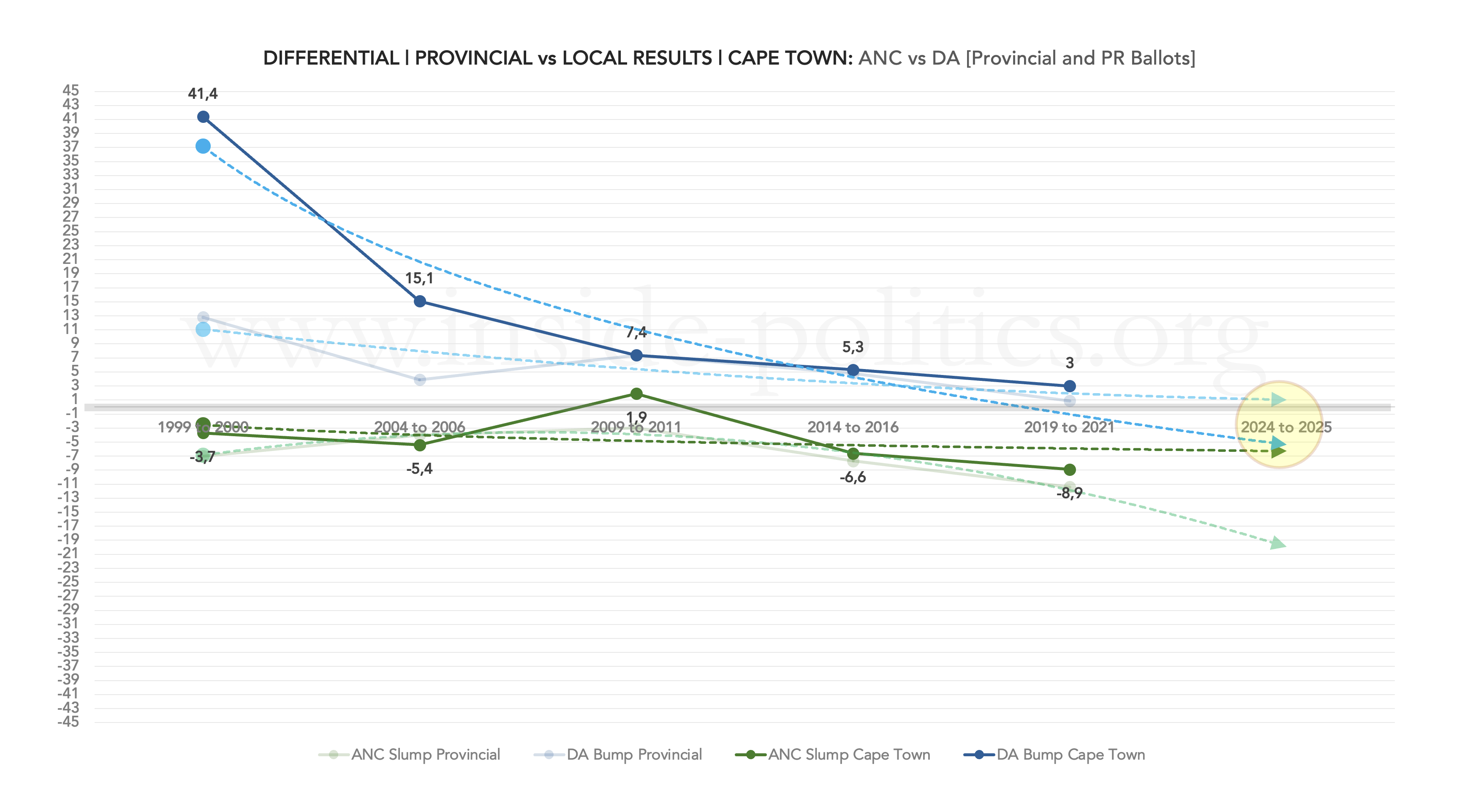 The exceedingly high differential the DA secured in 2000 is somewhat artificial, as it was a product of the party’s formation and the consolidation of Democratic Party and New National Party support. Nevertheless, while the party still enjoyed a positive differential in 2021 (+3 points), that is the smallest it has ever been, and—like elsewhere—the DA’s local-election “bump” has declined fairly dramatically. The trendline suggests it will become neutral in 2026/7.