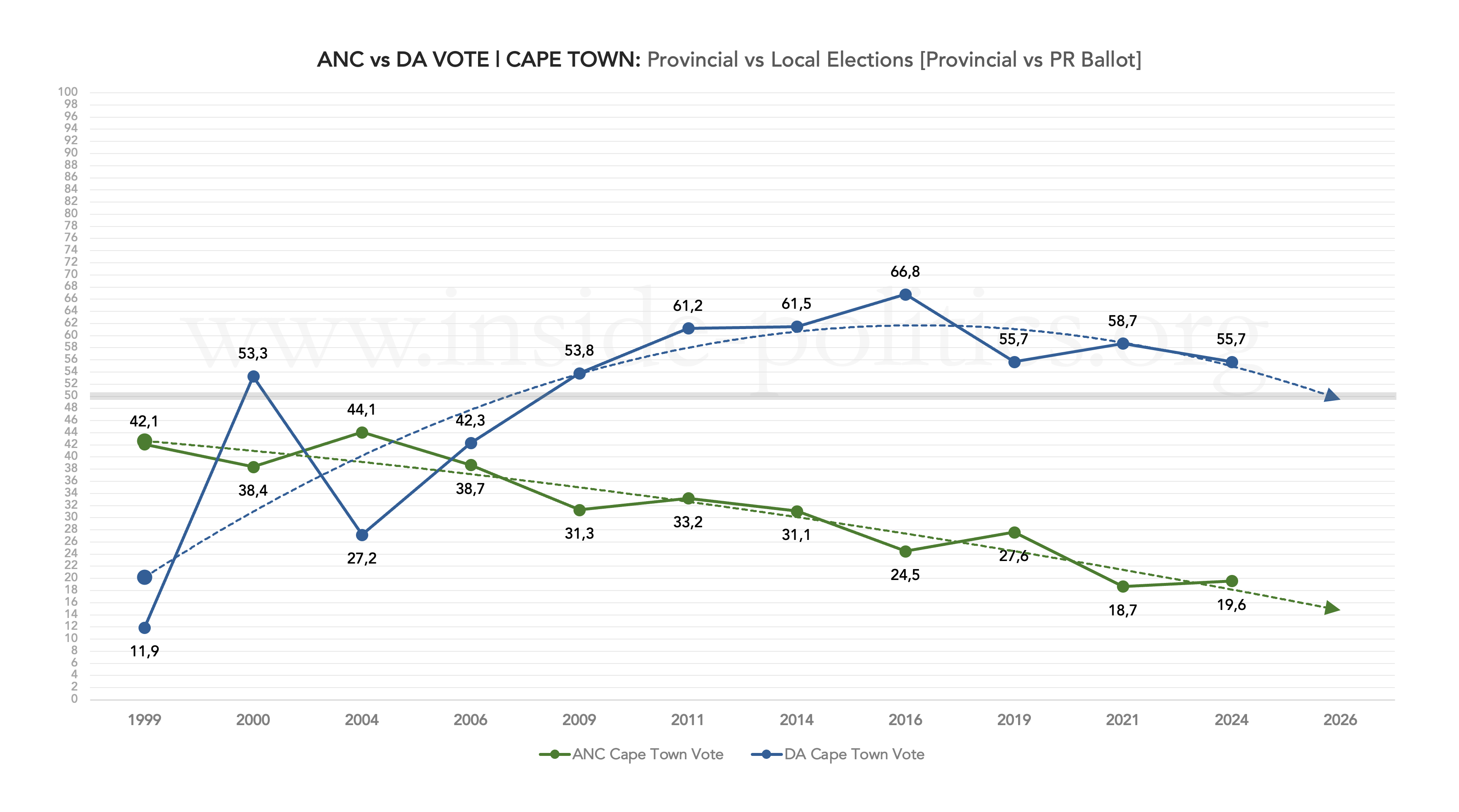 Since 2016, however, it has been tougher going. Turnout plummeted in 2021 (down 17 points from 2016)—again, as it did everywhere. There was a recovery in 2024 (back up to 61%), but not quite to the highs the DA is capable of achieving. The result of all that is that, instead of the DA enjoying a 60%-plus majority, it is now firmly in the 50% bracket—still comfortably above 50%, but more fragile than it has been for some considerable time.