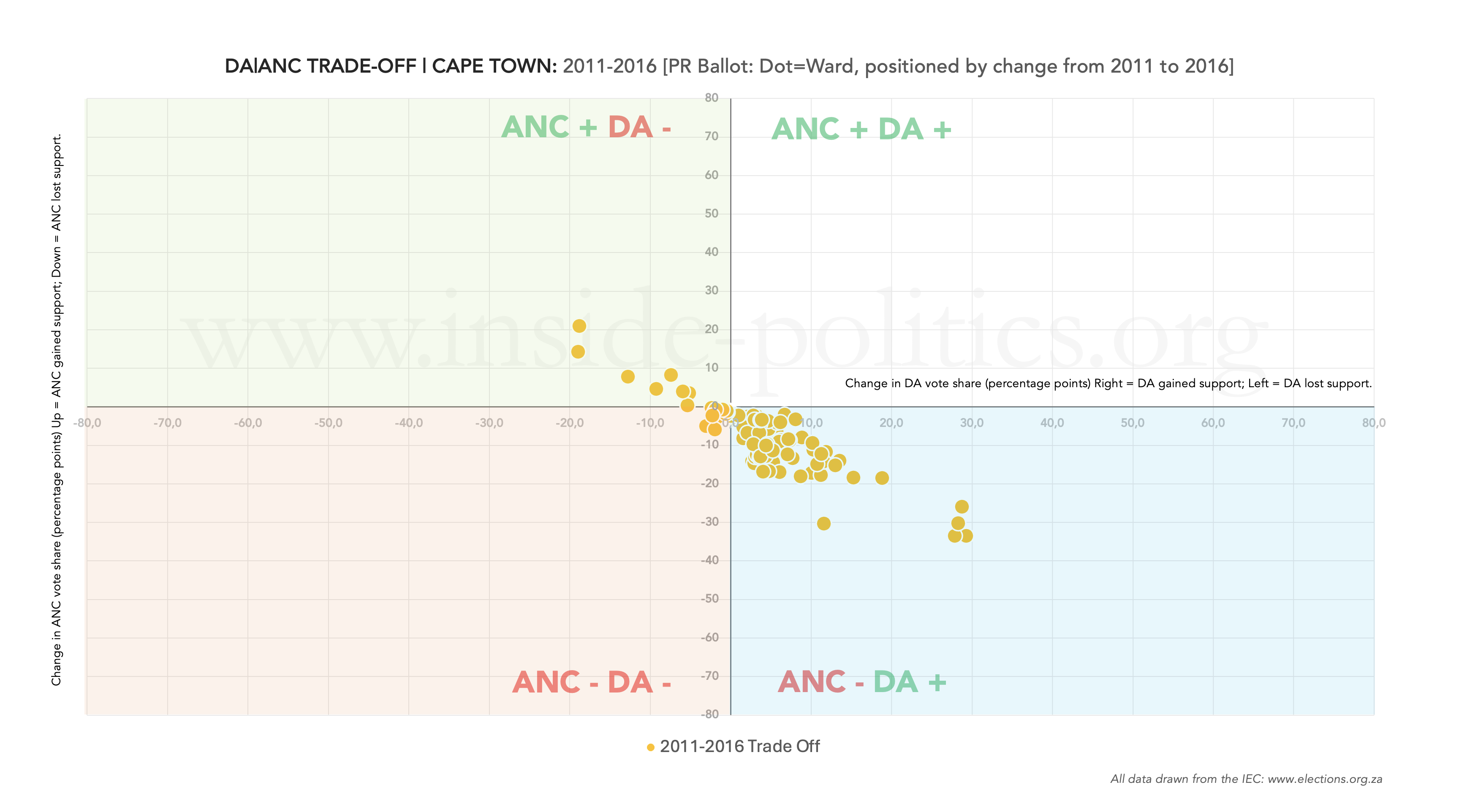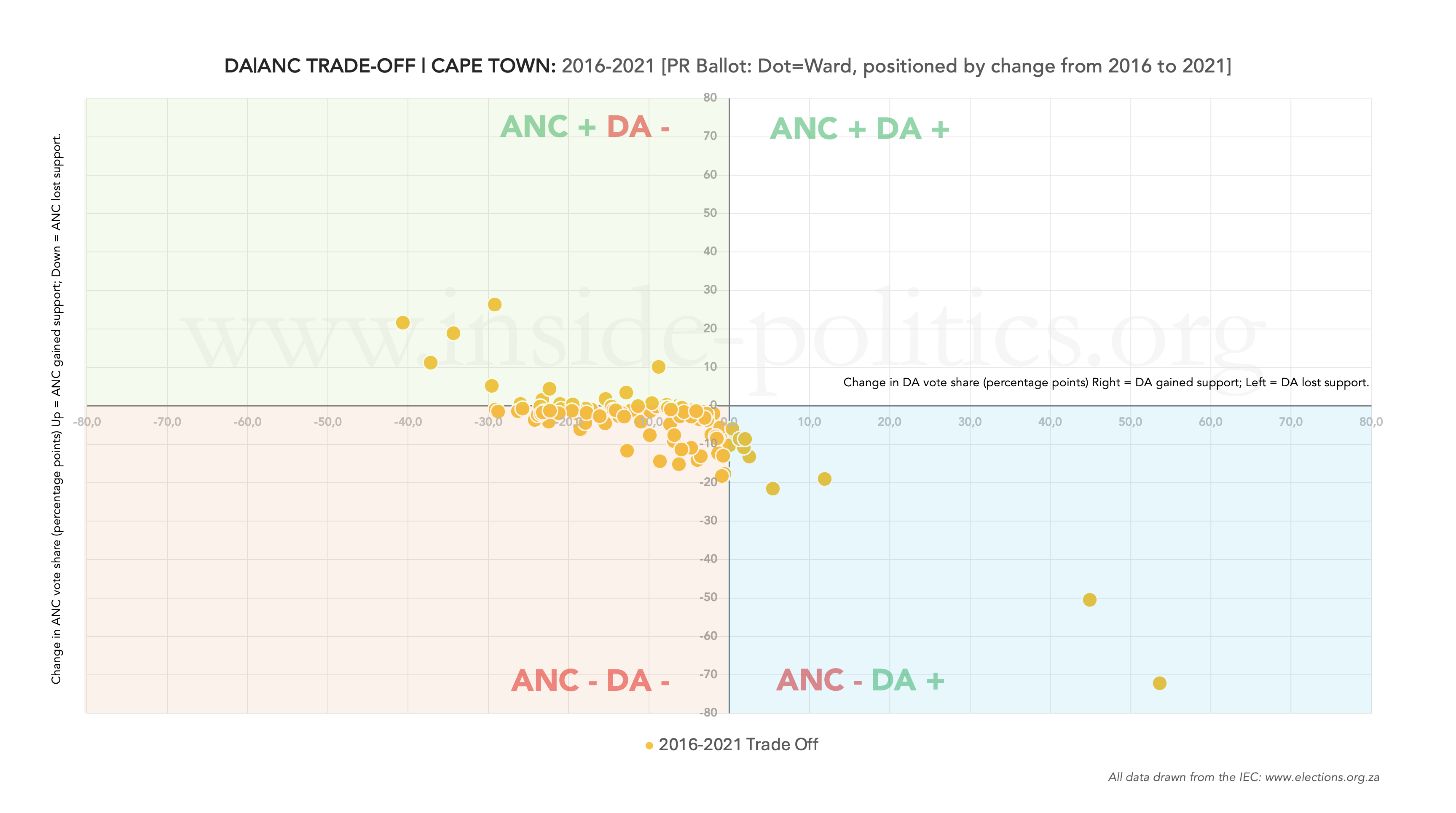 As usual, we conclude with trade-offs and the relationship between ANC and DA votes. If ANC votes go up, do DA votes go down? To track this, we again plot every ward as a dot on a grid, but this time each dot represents the change in support—not the ward itself. If the ANC gained in a ward, the dot moves up; if the DA gained, it moves right. Thus the grid divides into four quadrants: