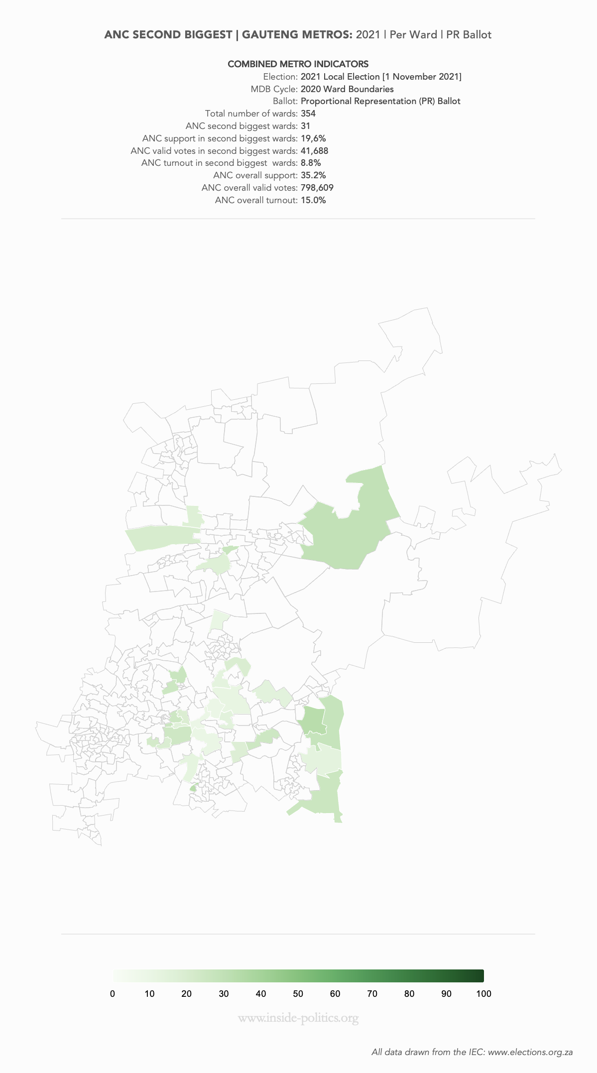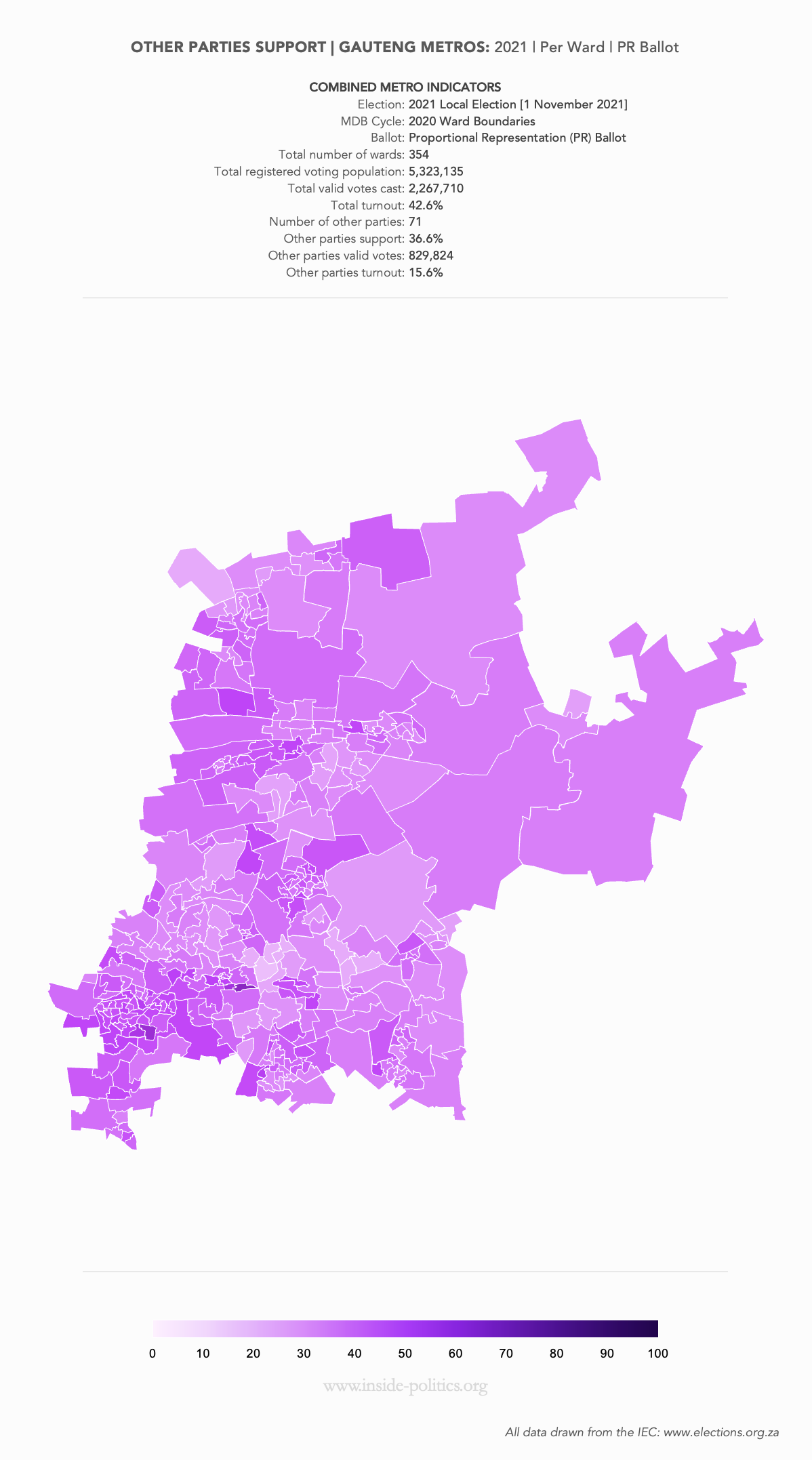 In 2021, that changed, however. Admittedly, not by much on the ward front – Other Parties won only 9/354 wards – but the intensity of ANC and DA support dropped dramatically.