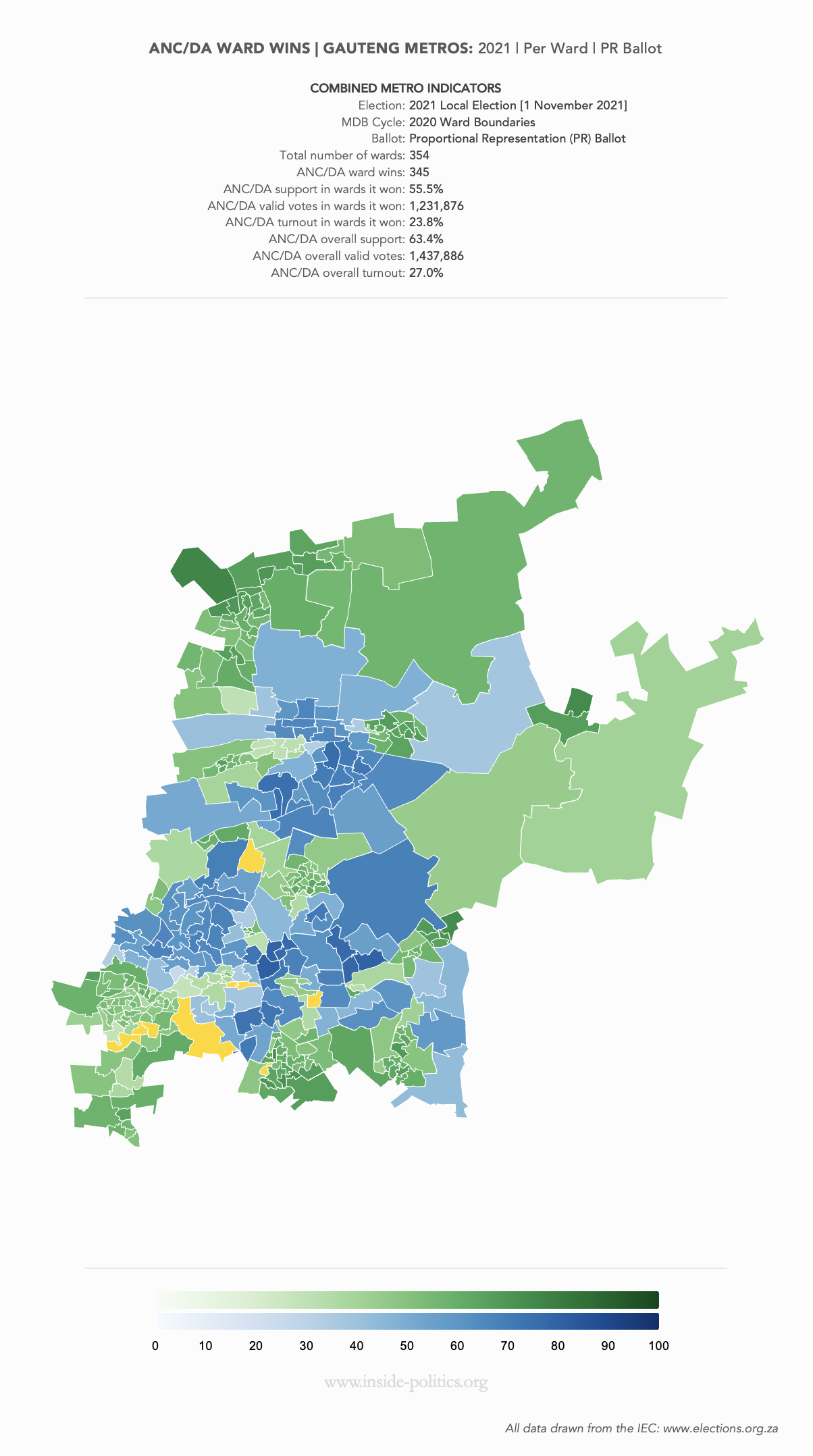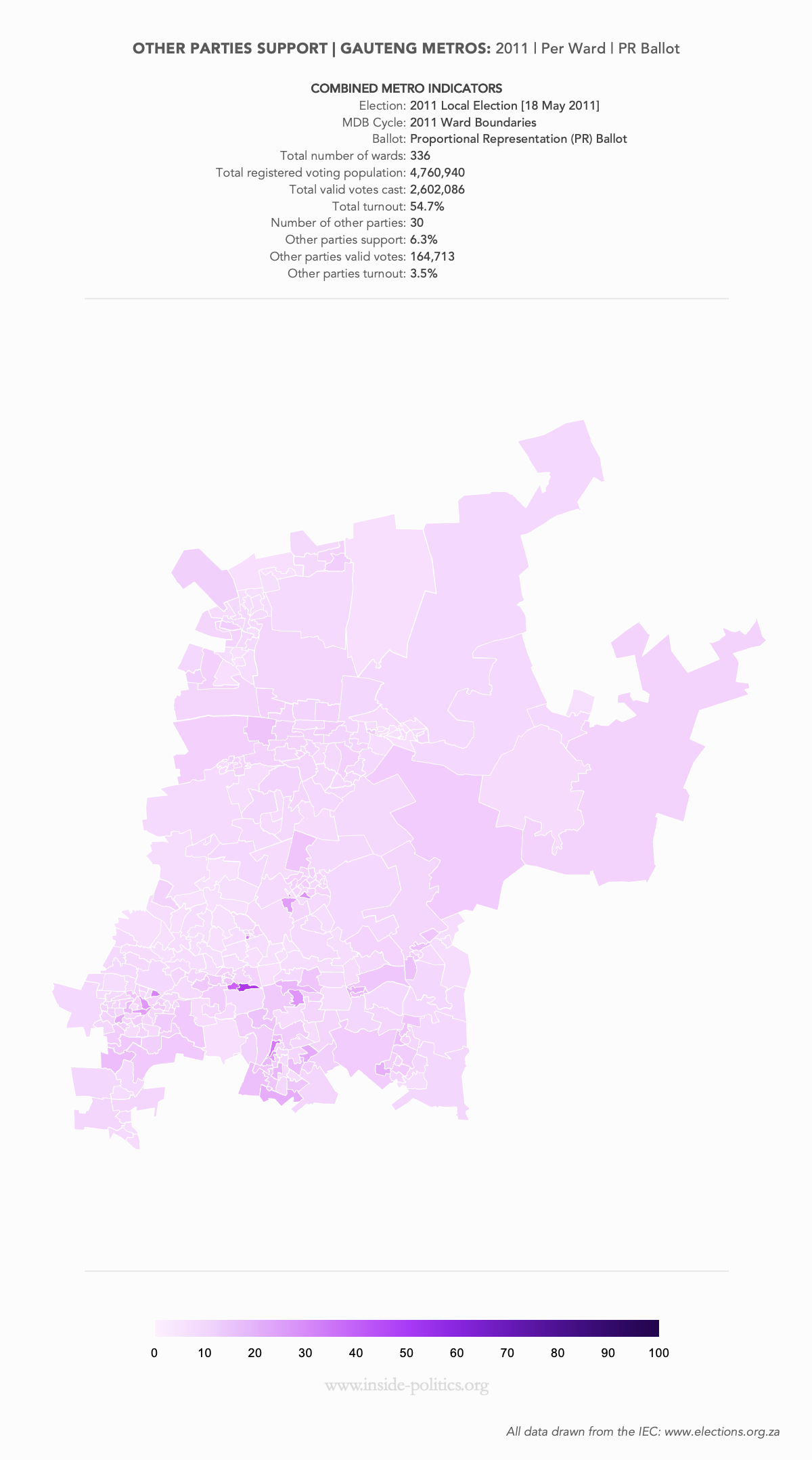 All heat maps for the three Gauteng metros – Johannesburg, Tshwane and Ekurhuleni – are up on the Resources Page. These three sets of maps allow us to take a consolidated view of Gauteng’s urban voting patterns, the purpose of this essay.