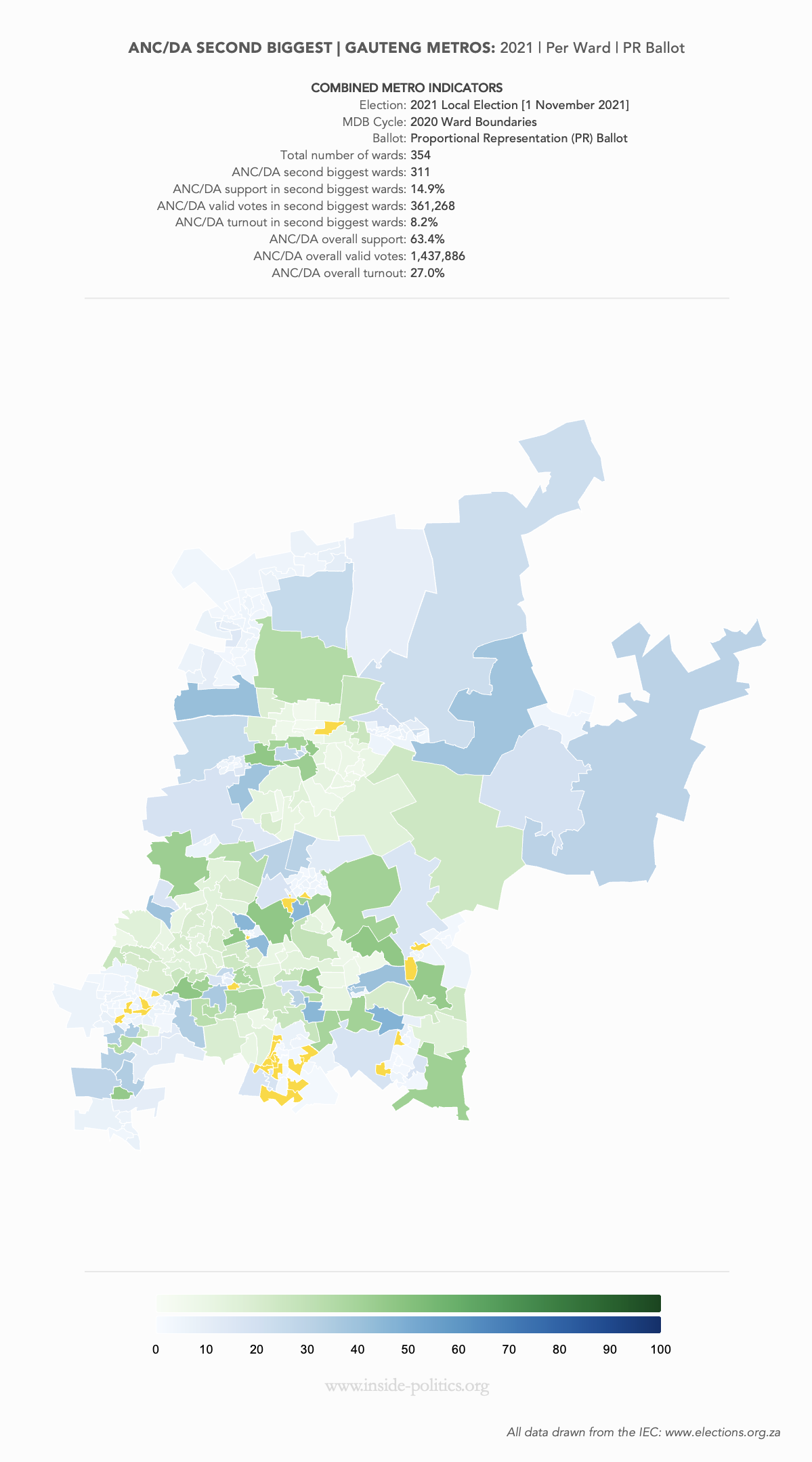 But all of this, whether 2011 or 2021, does little more than demonstrate the extent of the monopoly the ANC and DA have on Gauteng politics. Yes, the strength of their grip might be weakening, but as of the last local elections, they held the overwhelming majority of Gauteng’s urban wards in their hands. At least at first glance.