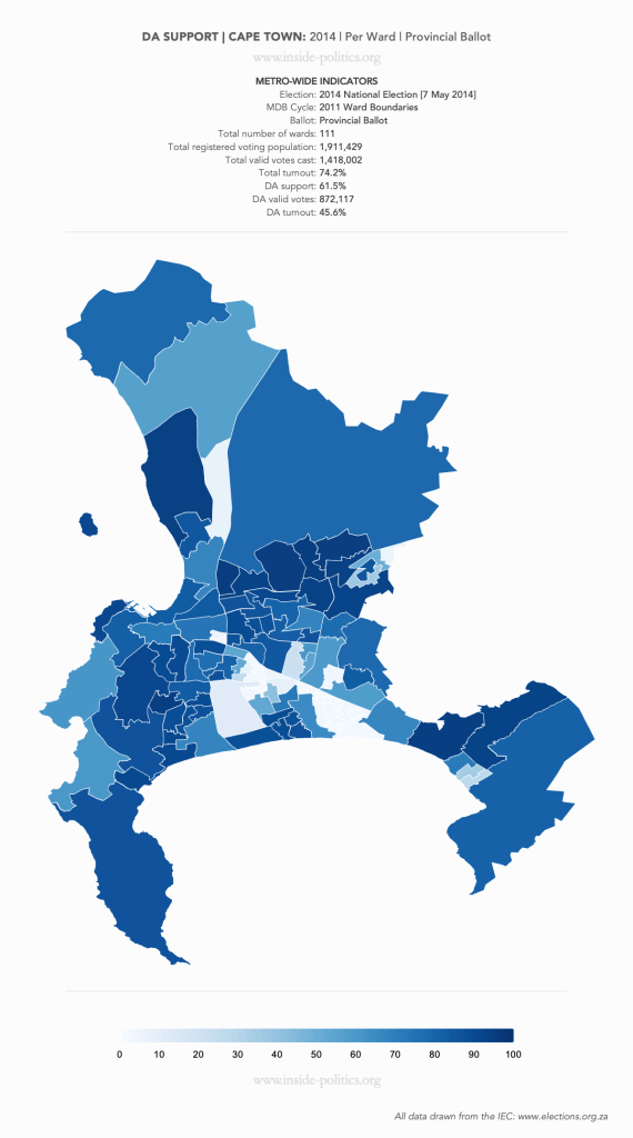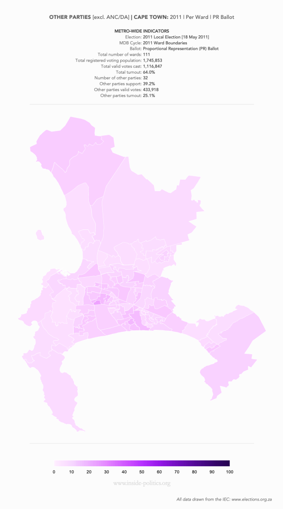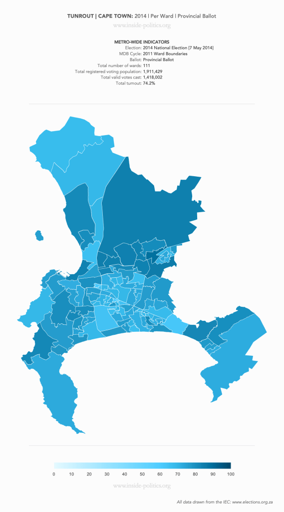 These are a set of what is commonly referred to as “Heat Maps”. The more technical name is Choropleth Maps. They are designed to use a colour scale, to demonstrate the intensity of one particular indicator – for example: party support per ward: the darker the colour in a ward, the higher the support. However, any indicator – turnout, registered voters, losses and gains, almost anything – can be mapped this way.