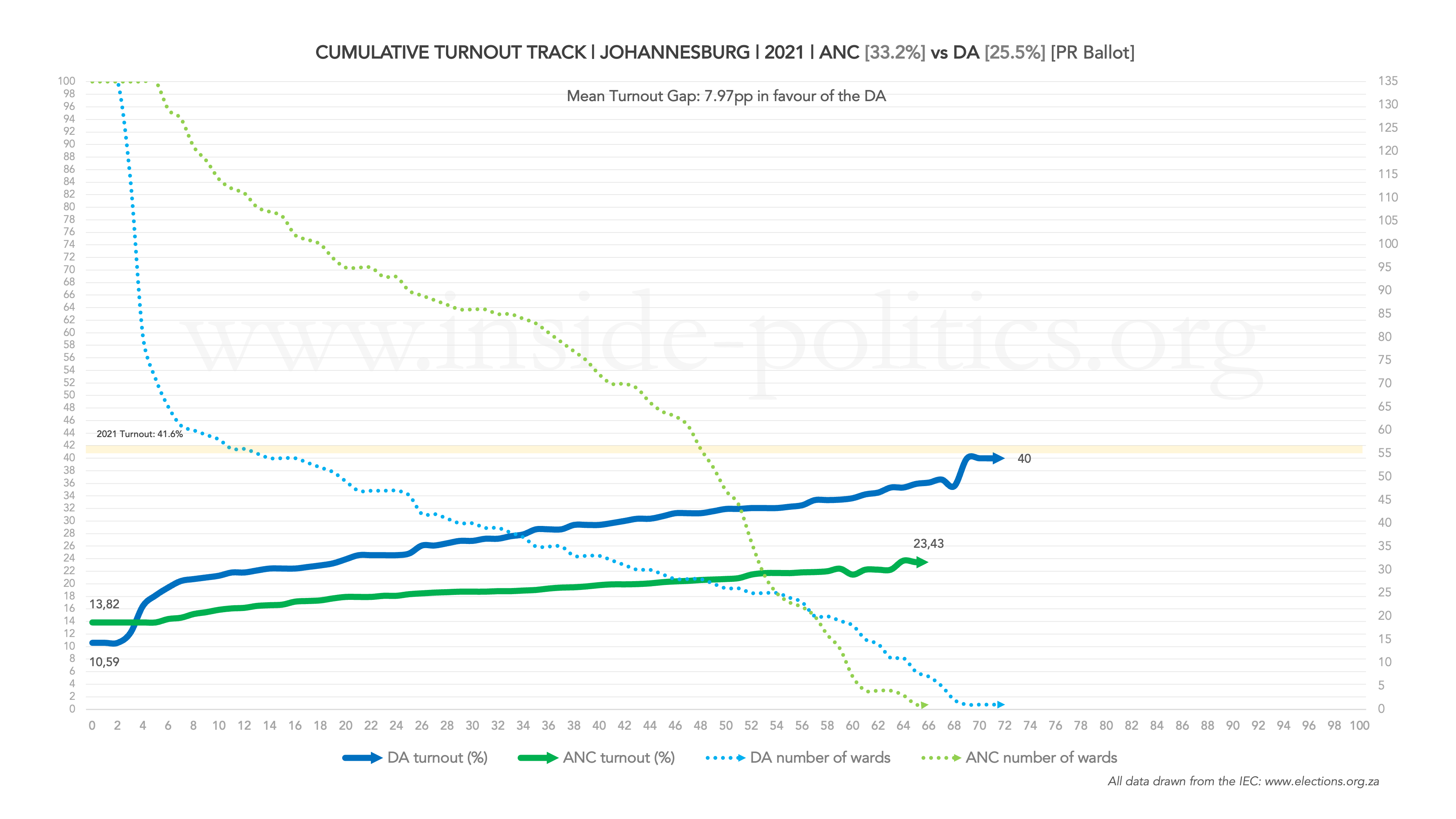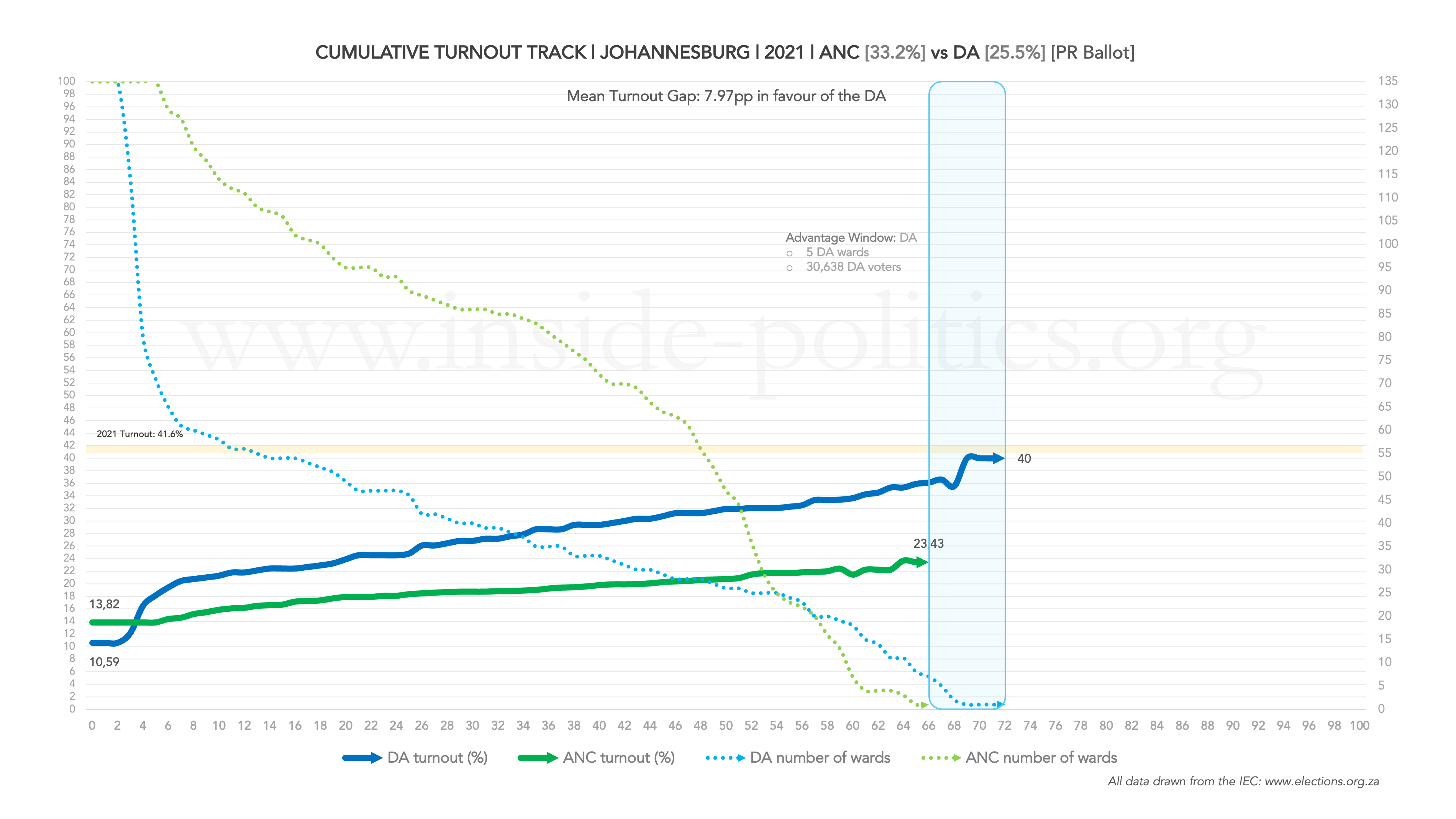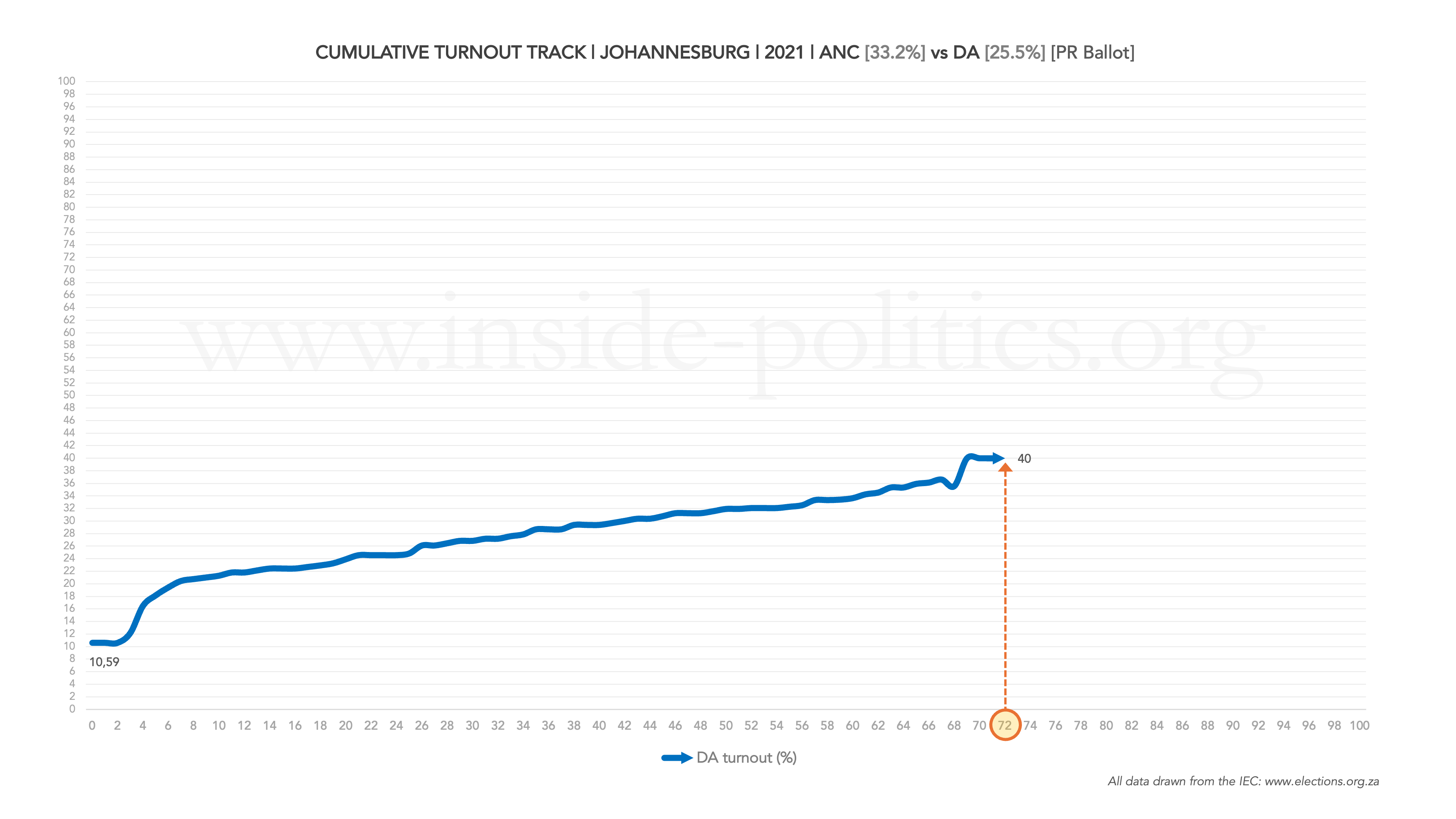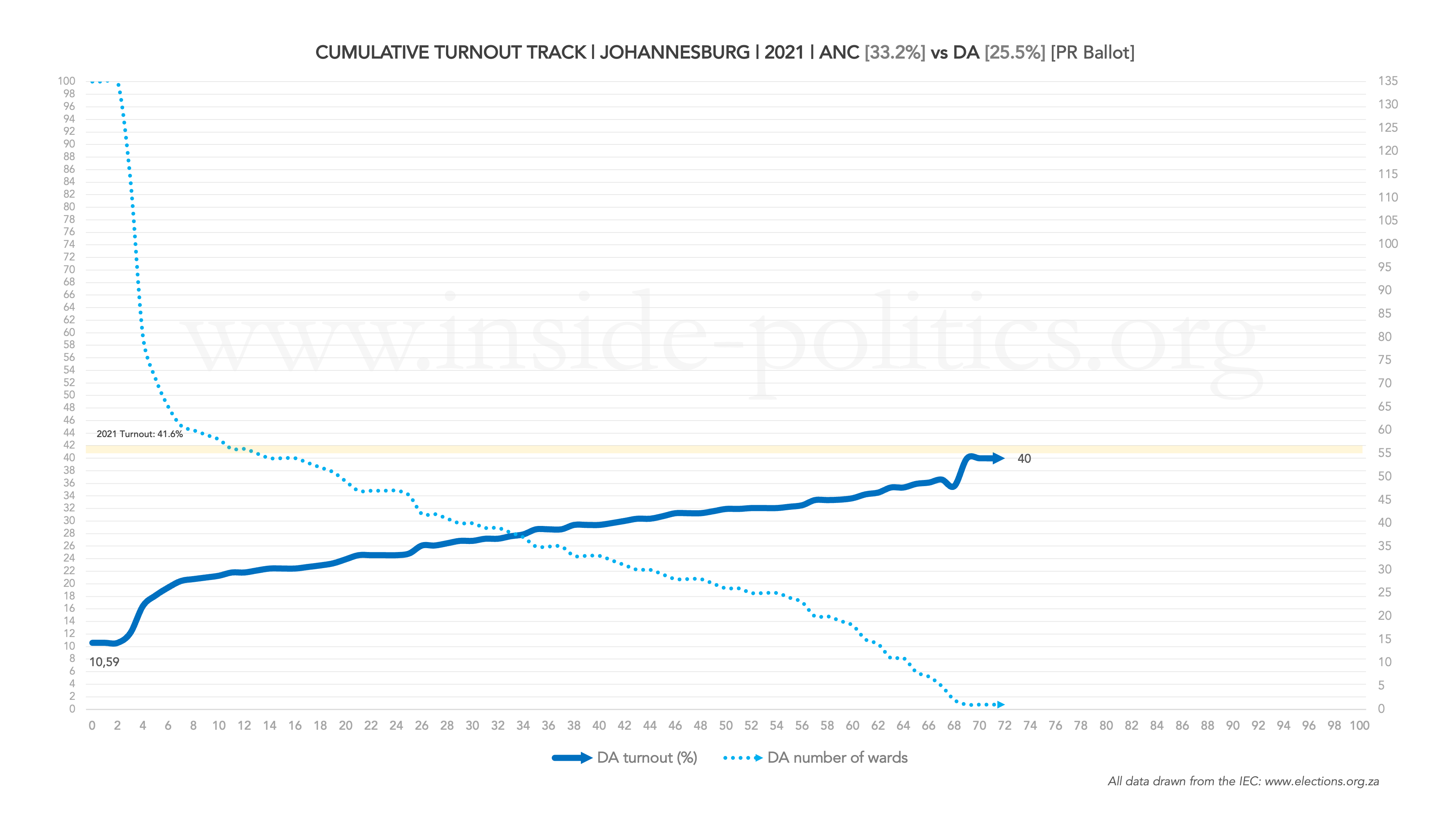 So, what can we tell from that? Well, for one, we can immediately see that the DA’s highest performing ward in JHB in 2021 delivered 72% (ward 72, as it so happens) – the point where the turnout track line stops. As the DA did not secure any vote share in any ward higher than that, there can be no more DA ward groups beyond that dot, and the line stops there. At that point, the DA track’s zenith, 40% of all registered voters in that ward, voted DA.