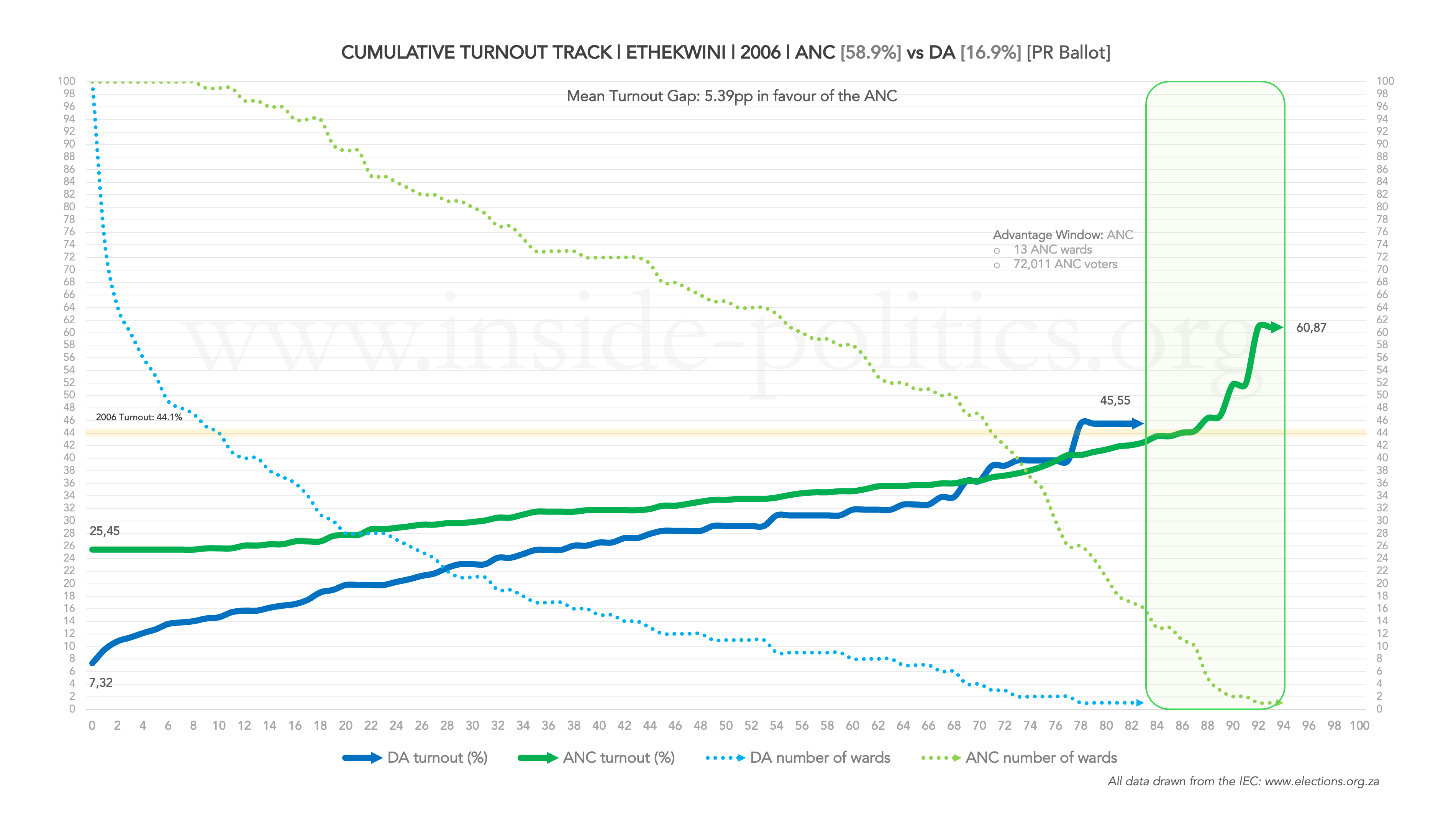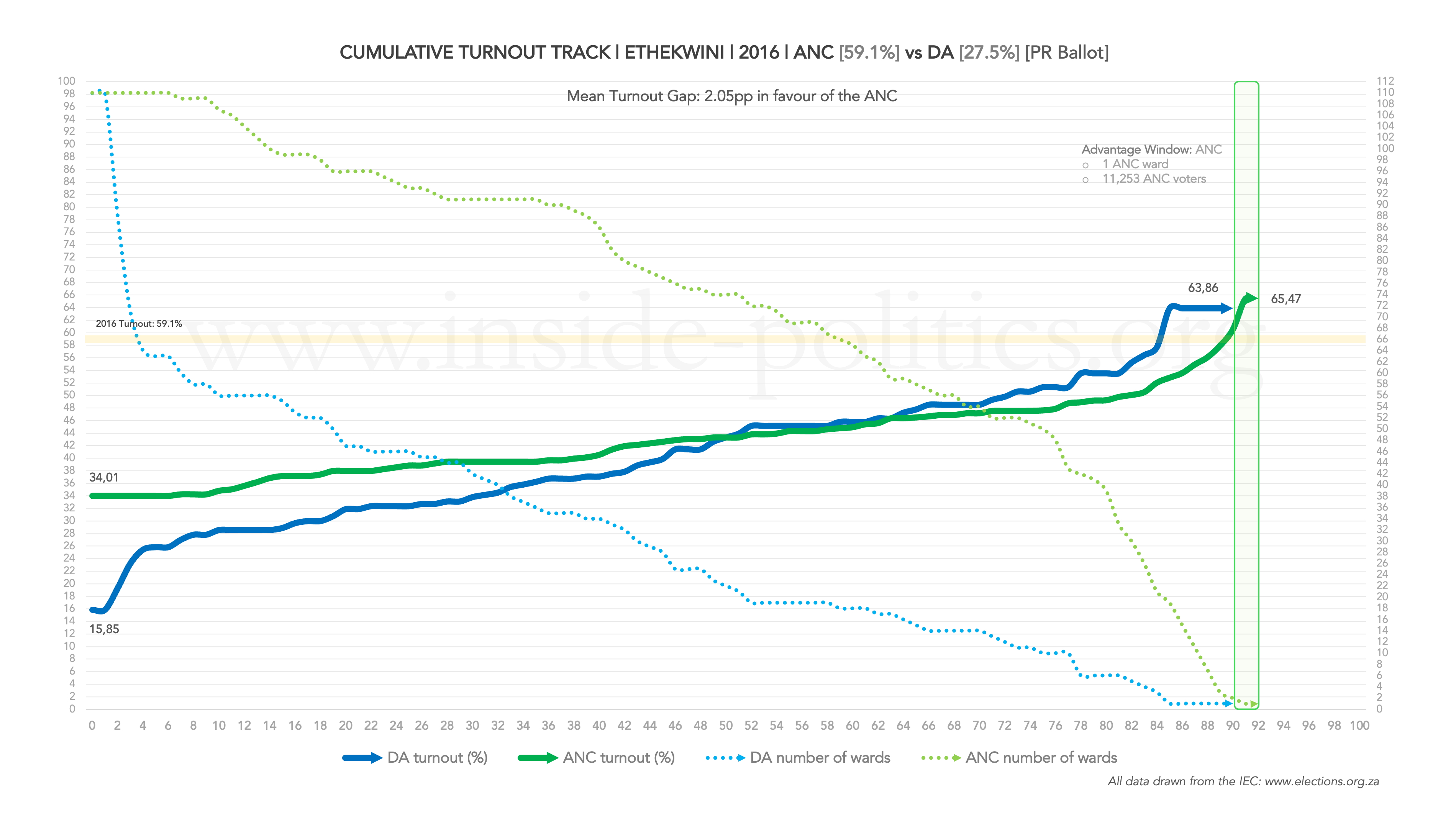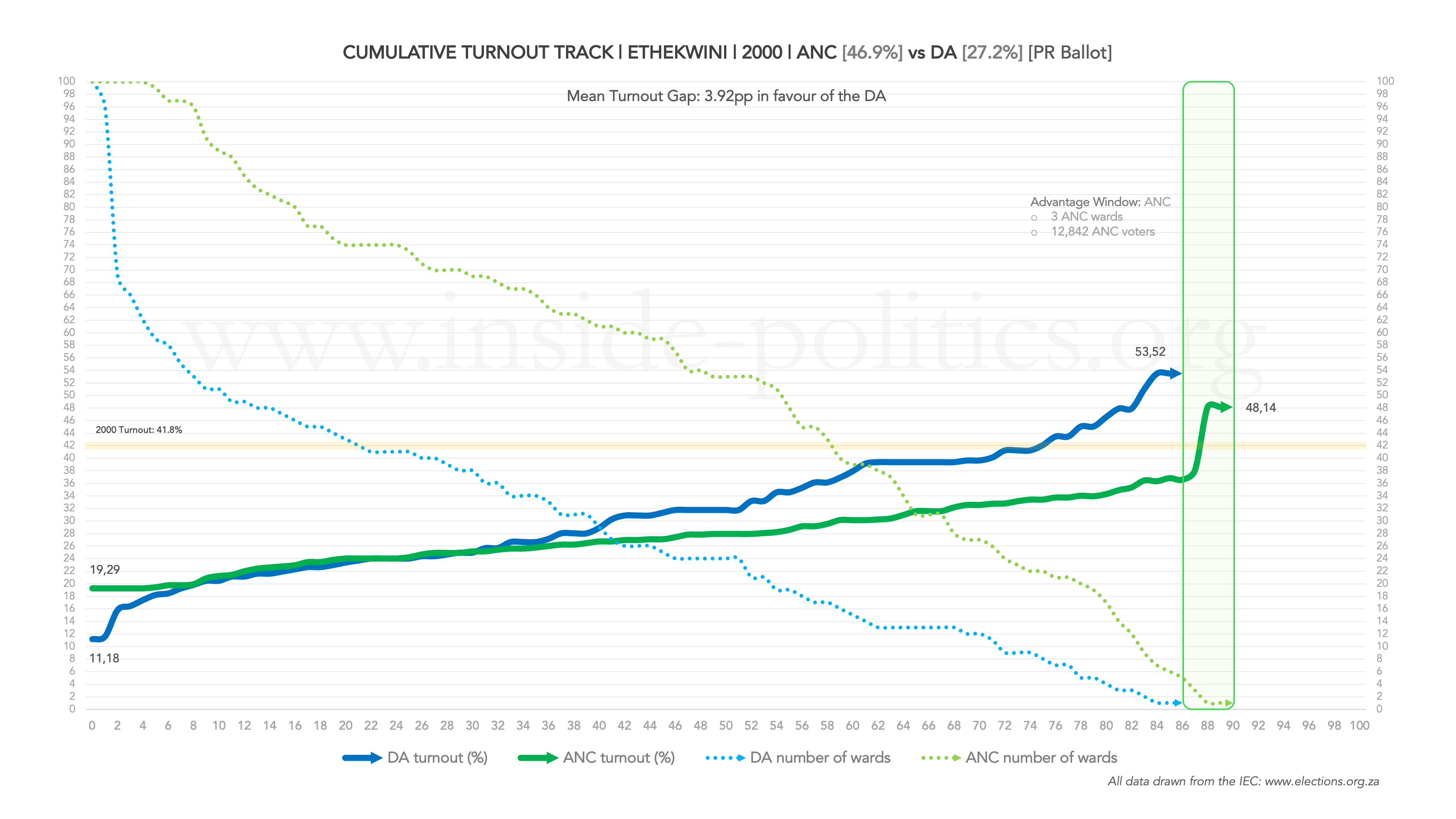 - Differential turnout between the ANC and the DA; that is, which party turned their voters out at a higher rate (if one party’s line is above the other, it means it was turning its voters out to a higher degree than the party below it – you can also see the average size of the gap at the top of the graph).