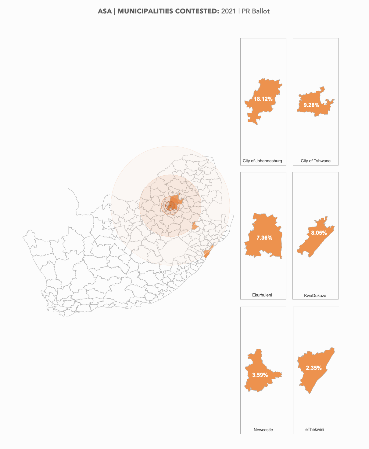 In 2021, ASA only competed in six municipalities. The map above shows each of them (orange), with concentric circles starting around Johannesburg and expanding towards eThekwini. Generally, the further away from its epicentre the party competed, the worse it performed (from 18.12% in JHB, to 2.35% in ETH).
