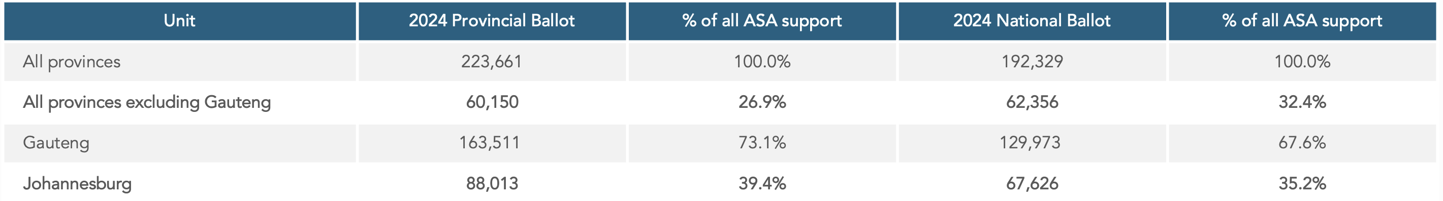 Excluding Gauteng, all eight other provinces contributed just 26.9% towards ASA’s total support. Gauteng alone was responsible for the rest: 73.1%. And, within Gauteng, Johannesburg alone was responsible for 39.4% of all ASA support.