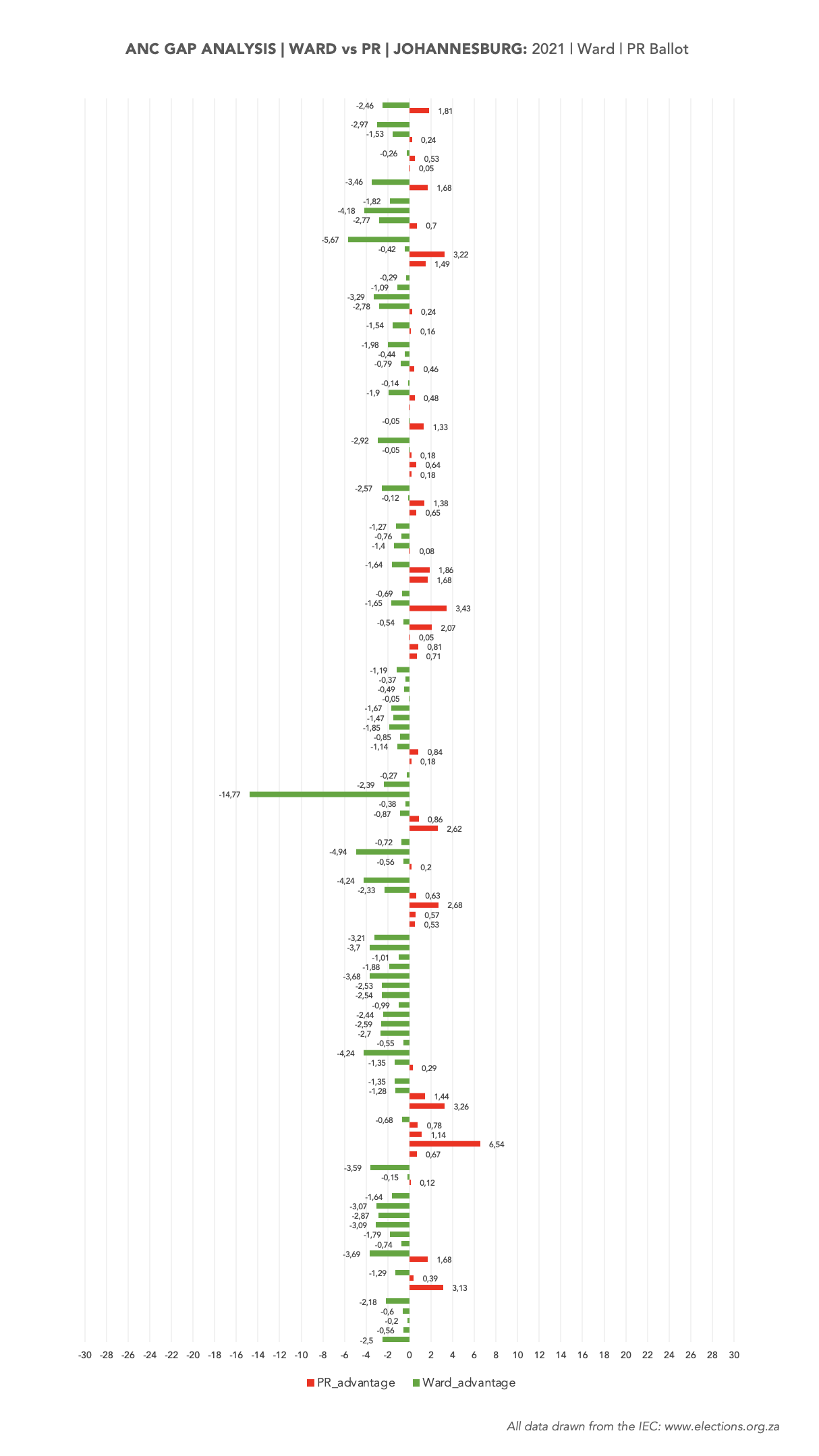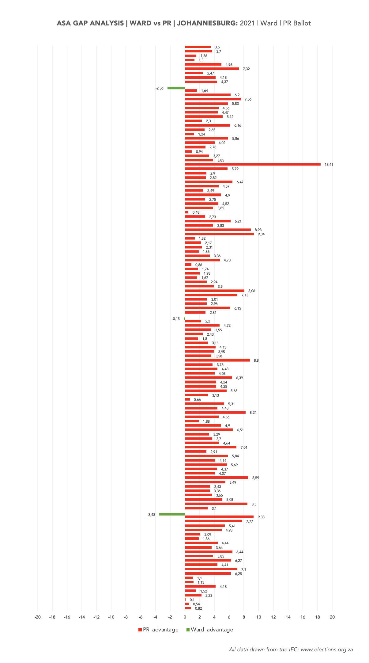 The graph above (left, I have included the ANC’s graph, right, for comparative purposes) shows how ASA’s 2021 Johannesburg vote split between the Ward and PR ballot, per ward. The red bars illustrate wards where ASA’s PR vote exceeded its Ward vote; the green bars vice versa. With the exception of just three wards, ASA scored significantly more PR than Ward votes in every other ward.