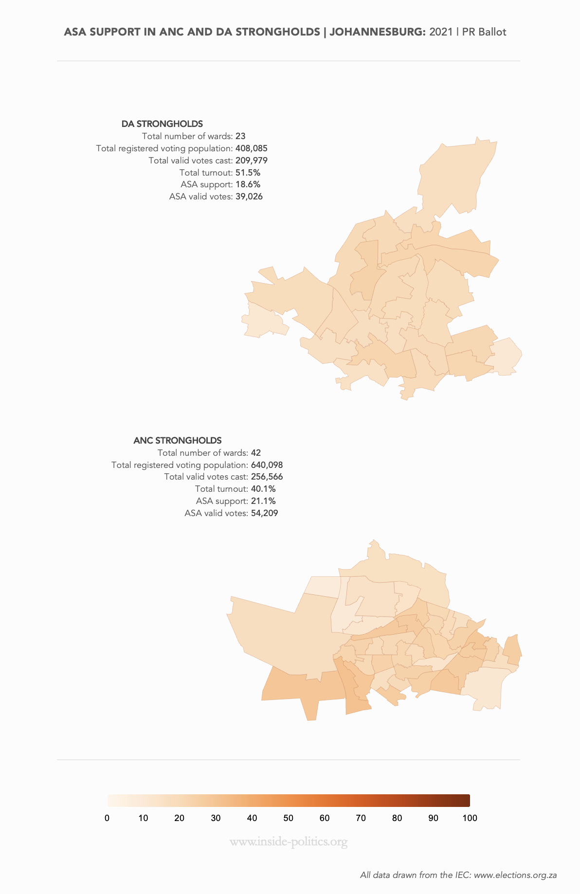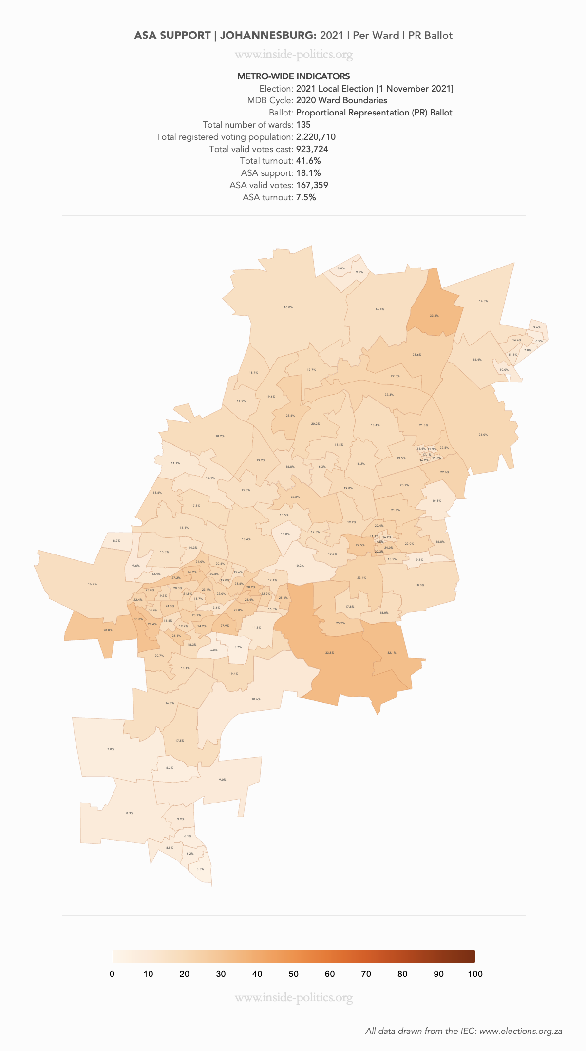 For Johannesburg’s 2021 135-ward total, ASA’s ward-level performance breaks down as follows:
