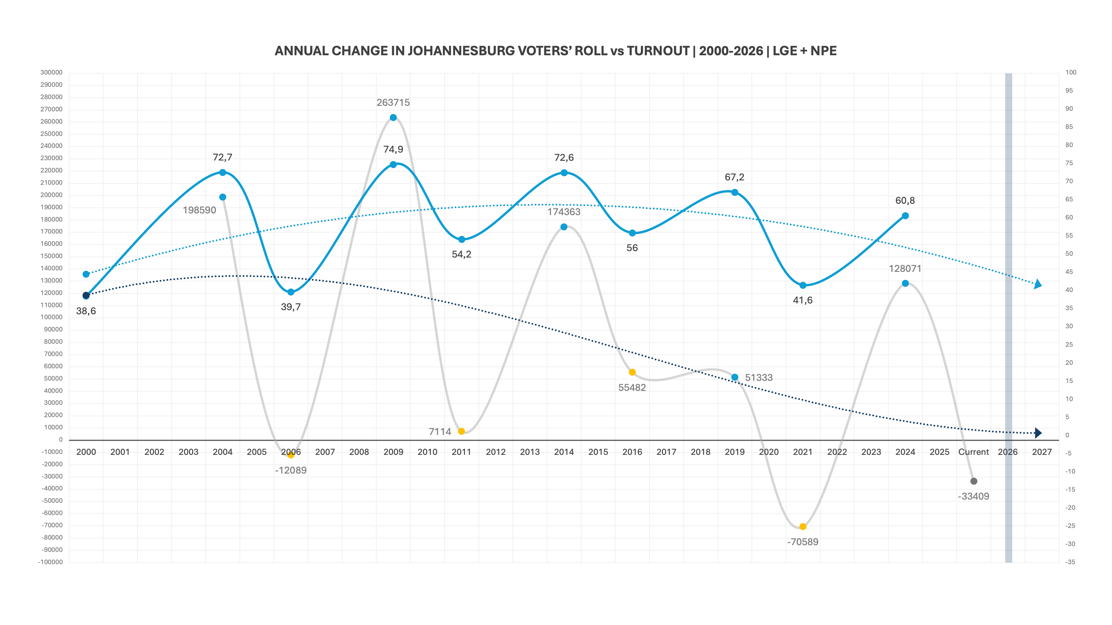 Here is Johannesburg’s turnout (on the PR and provincial ballot), over time and mapped against changes in the voters’ roll: