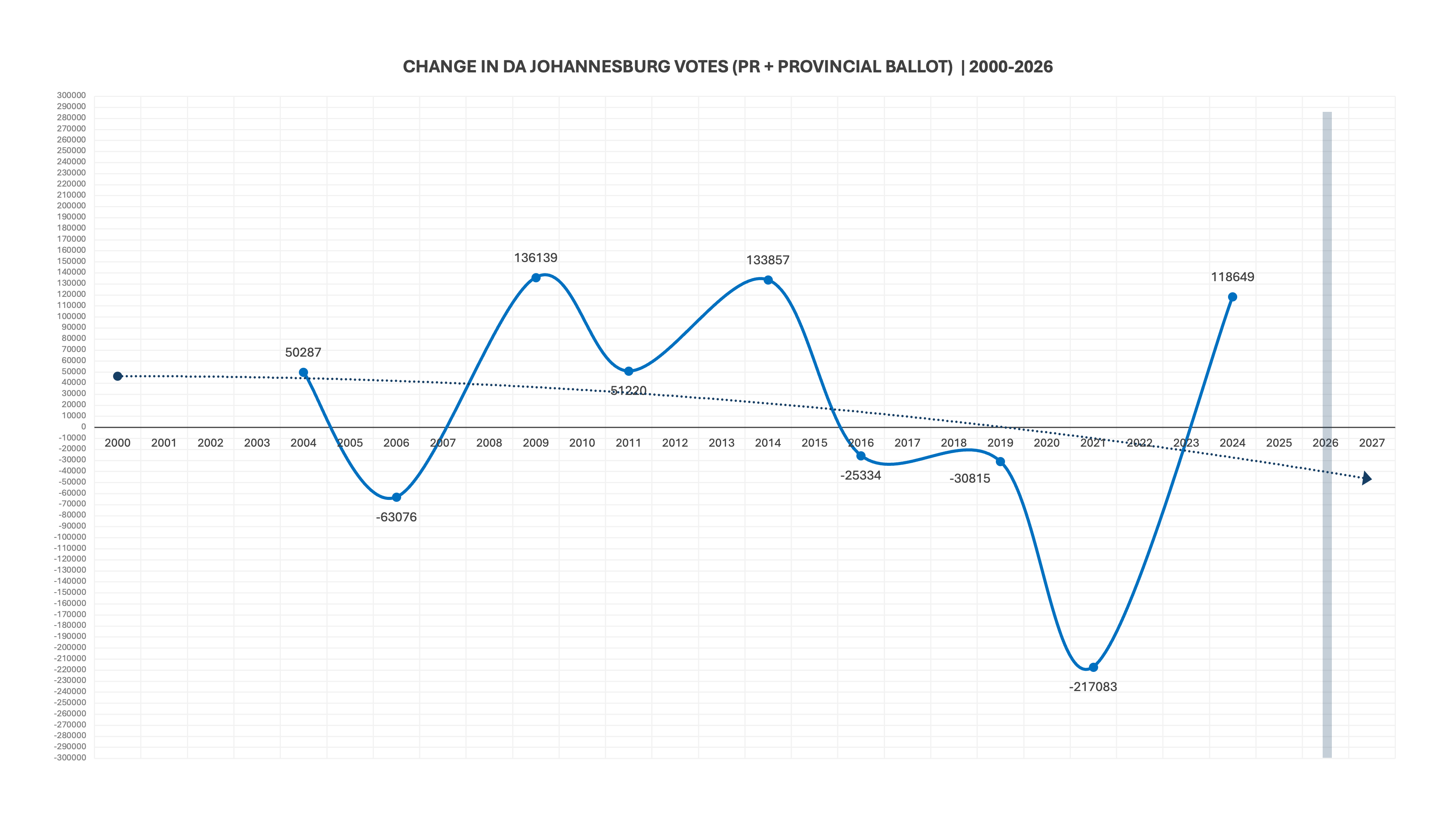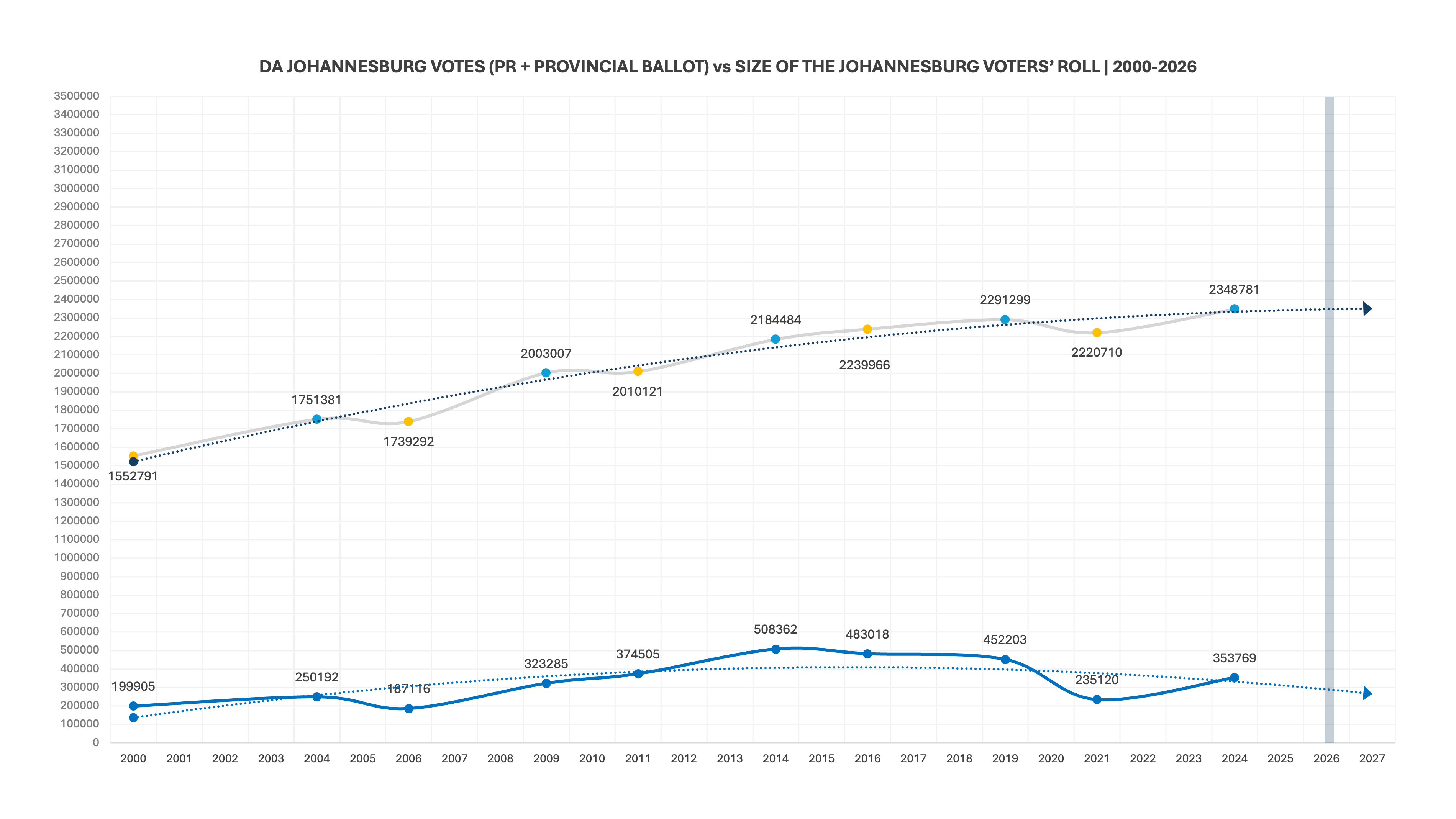 Here is the total number of votes the DA has achieved in JHB since 2000 (using the PR and provincial ballot). Notice how closely the DA’s performance mirrors the voters’ roll trend-line.