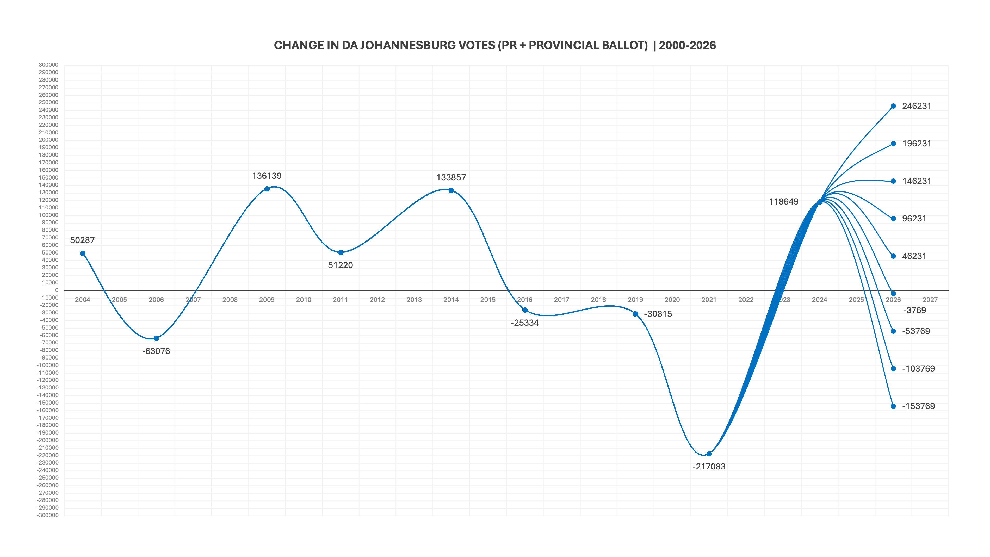 So, let us again cover all eventualities, and give the DA a potential vote range from 200,000 to 600,000. If we plot those possibilities, at increments of 50,000 votes, we get the following: