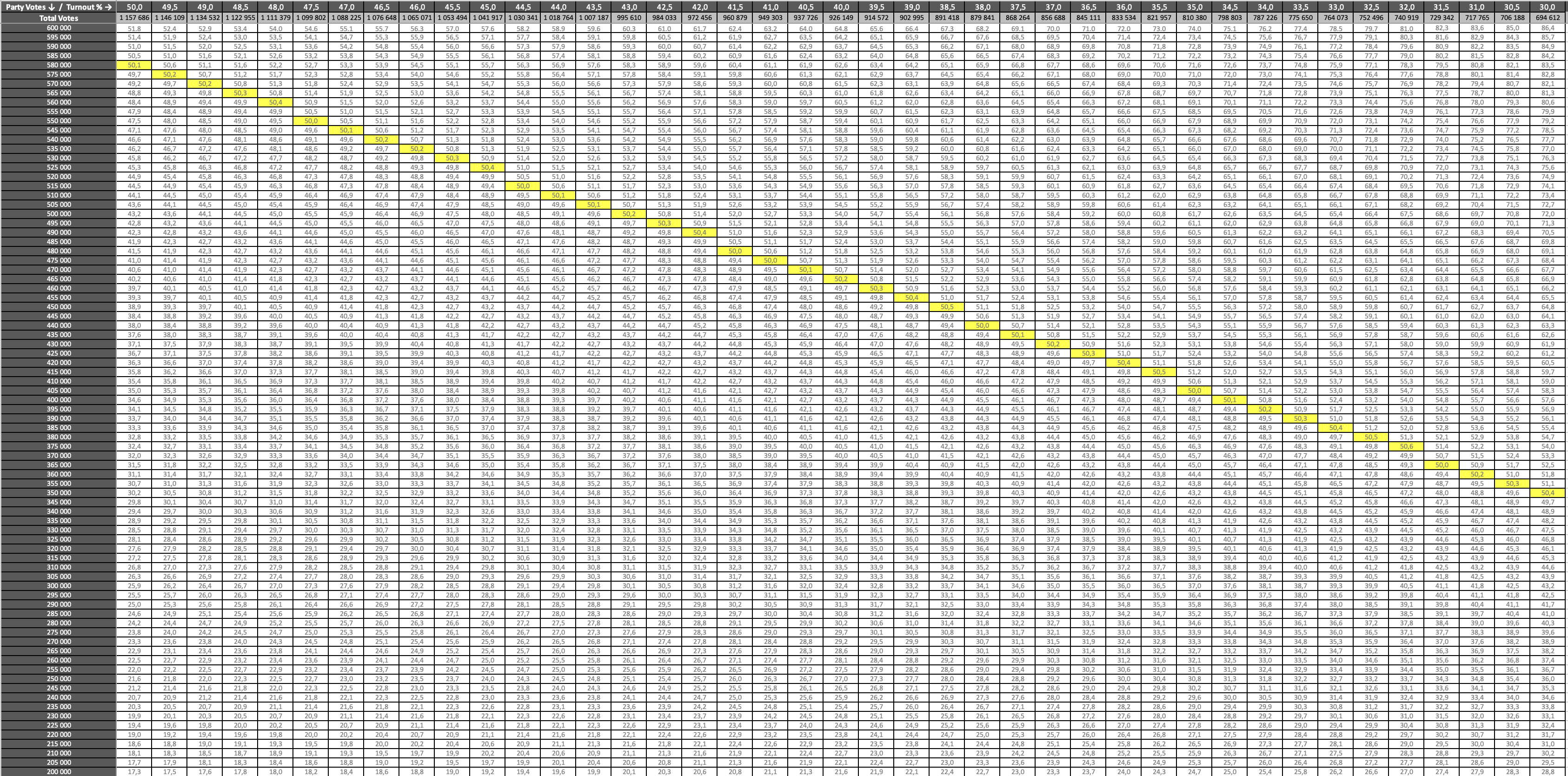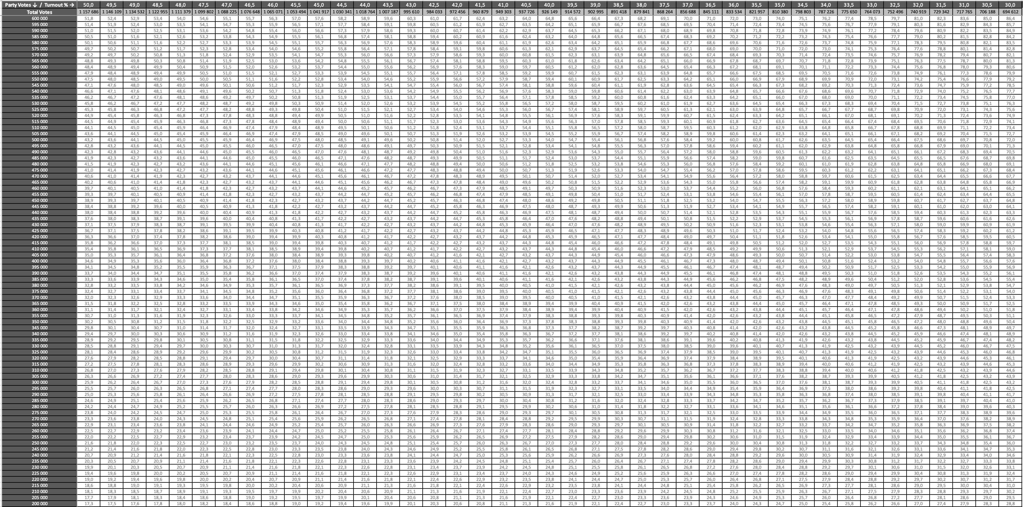 Down the left hand side run the DA vote scenarios (200,000 at bottom; 600,000 at top, in increments of 5,000 votes). Along the very top run the turnout levels (50% on the left, down to 30% on the right, in increments of 0.5%). Below that line, also on the top, is the number of valid votes that would be cast for this model. This is the baseline model, so it uses at total registered pool of 2,315,372 (the current IEC total for JHB) to calculate the total valid votes for each turnout level.