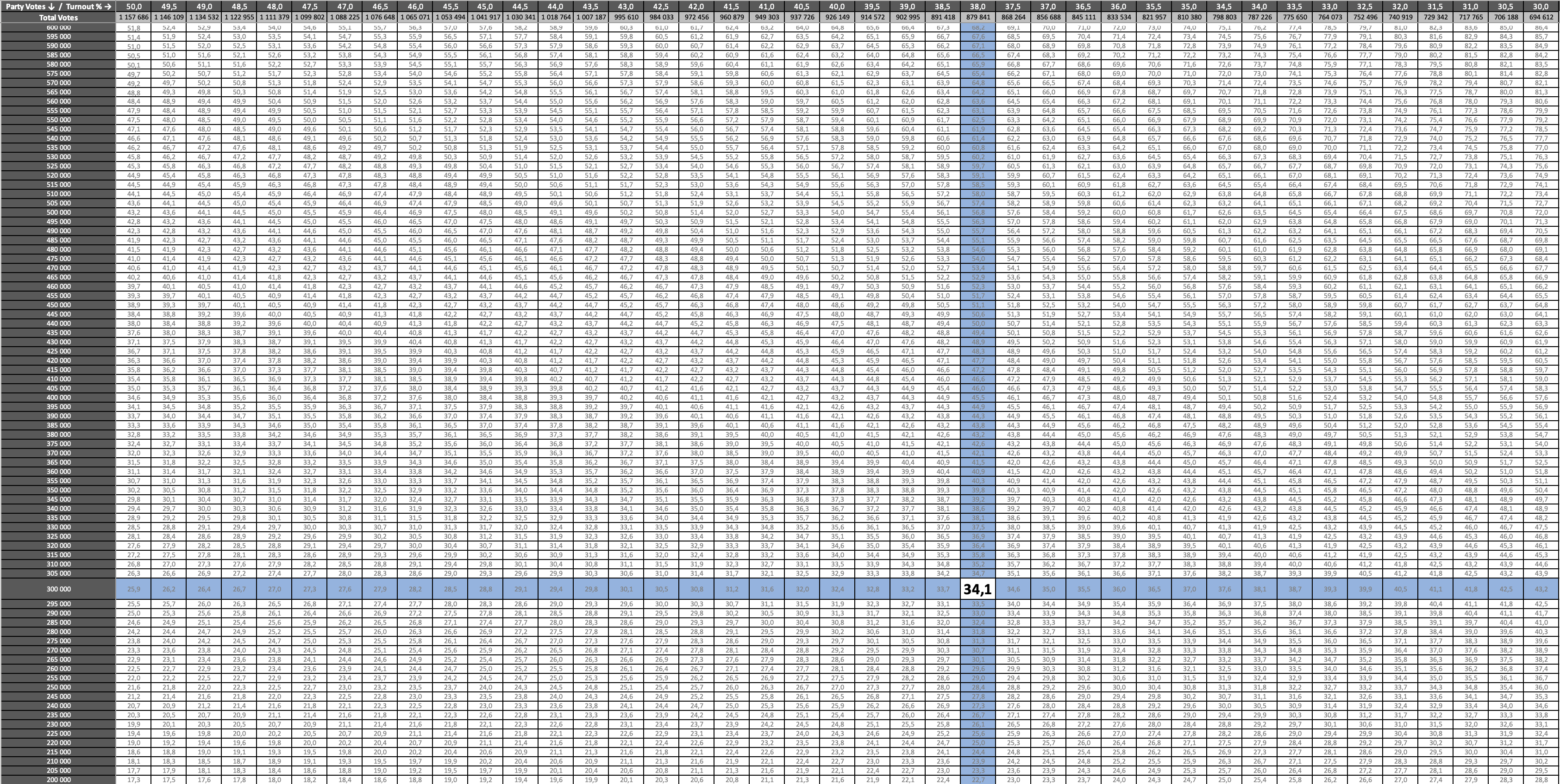 As with turnout, the actual increments we will use in our models will be smaller: 5,000 votes per step, which will give us far more accuracy.