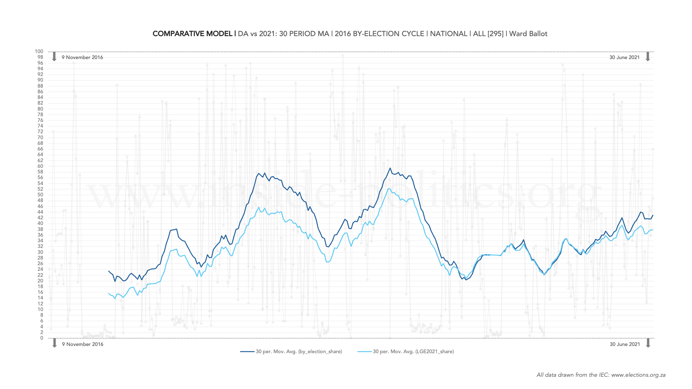 A comparative model tracks support for either the ANC, DA or EFF per cycle (you can see this faded in the background) against each party’s support in the election that followed that cycle. In other words: it allows you to see how by-election results stacked up against the actual LGE that followed them. But the core indicator is the moving average – the solid visible line, which is set at 30 periods.