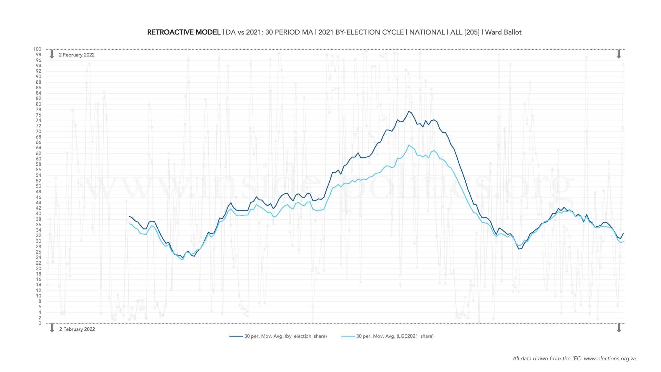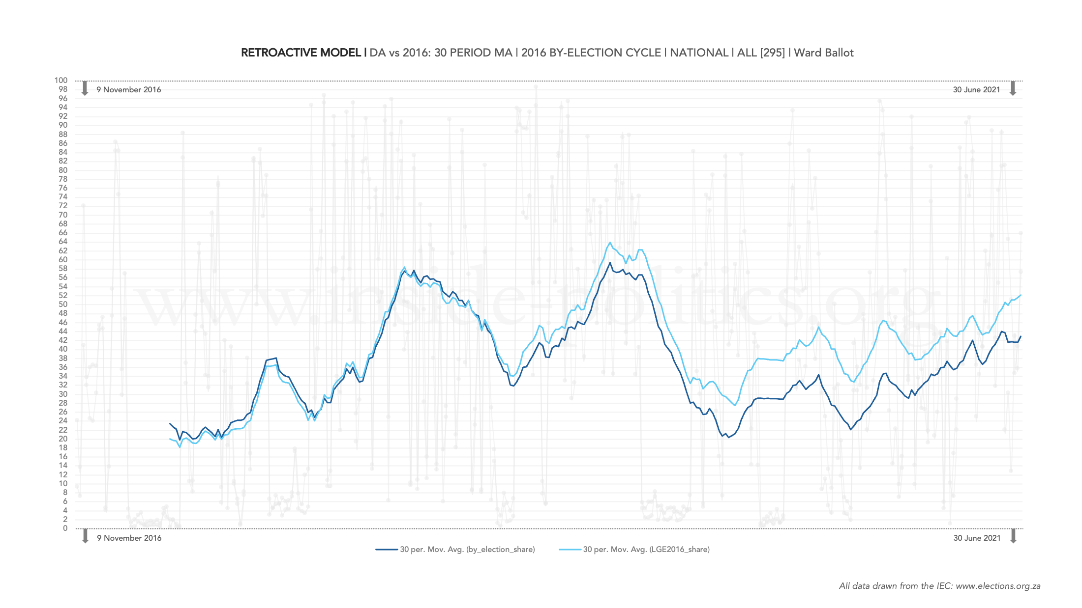 A retroactive model tracks support for either the ANC, DA or EFF per cycle (you can see this faded in the background) against each party’s support in the previous LGE election before that cycle. In other words: it allows you to see how by-election results stacked up against the last LGE, and the direction support headed in comparatively. But the core indicator is the moving average – the solid visible line, which is set at 30 periods.