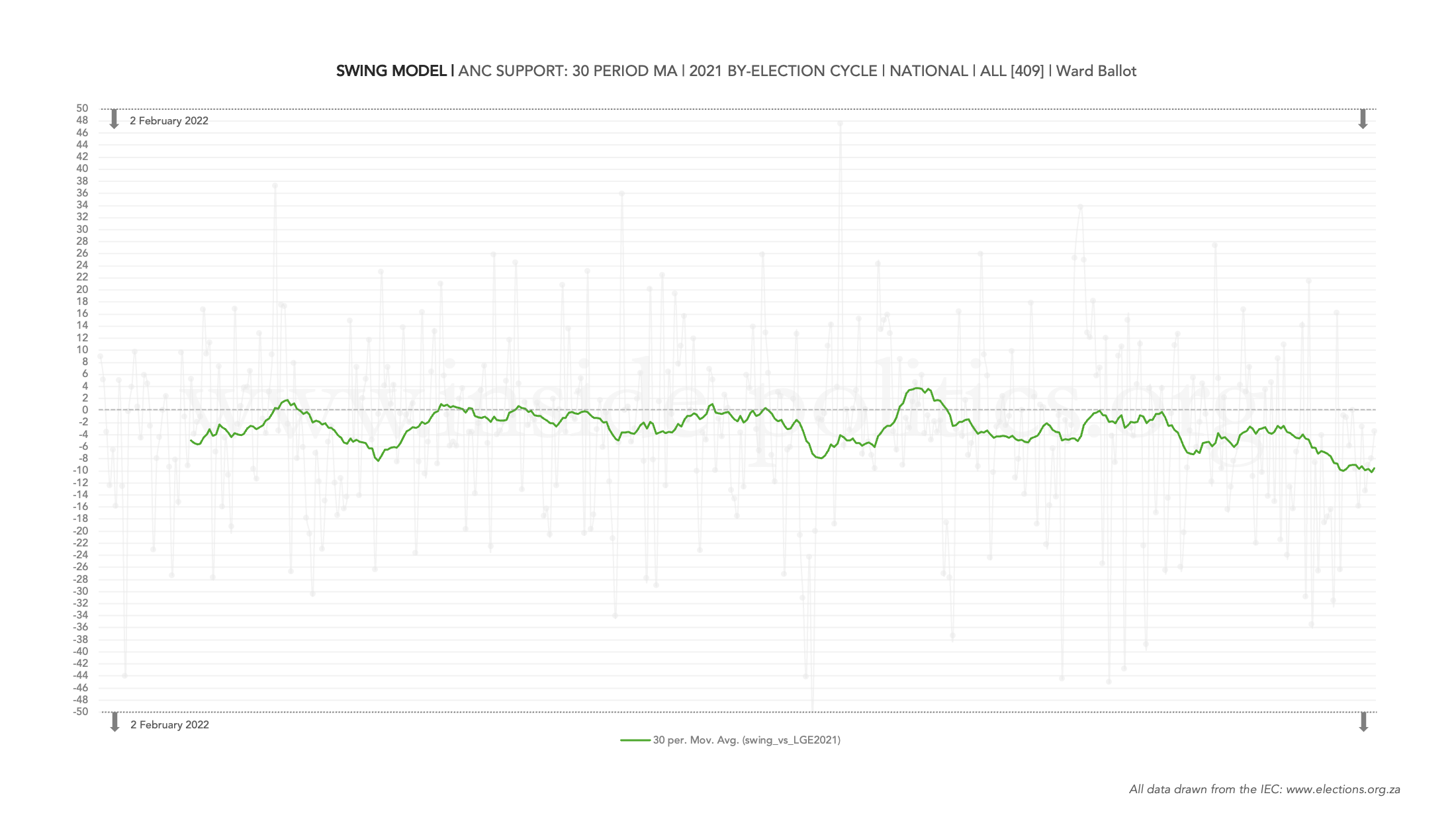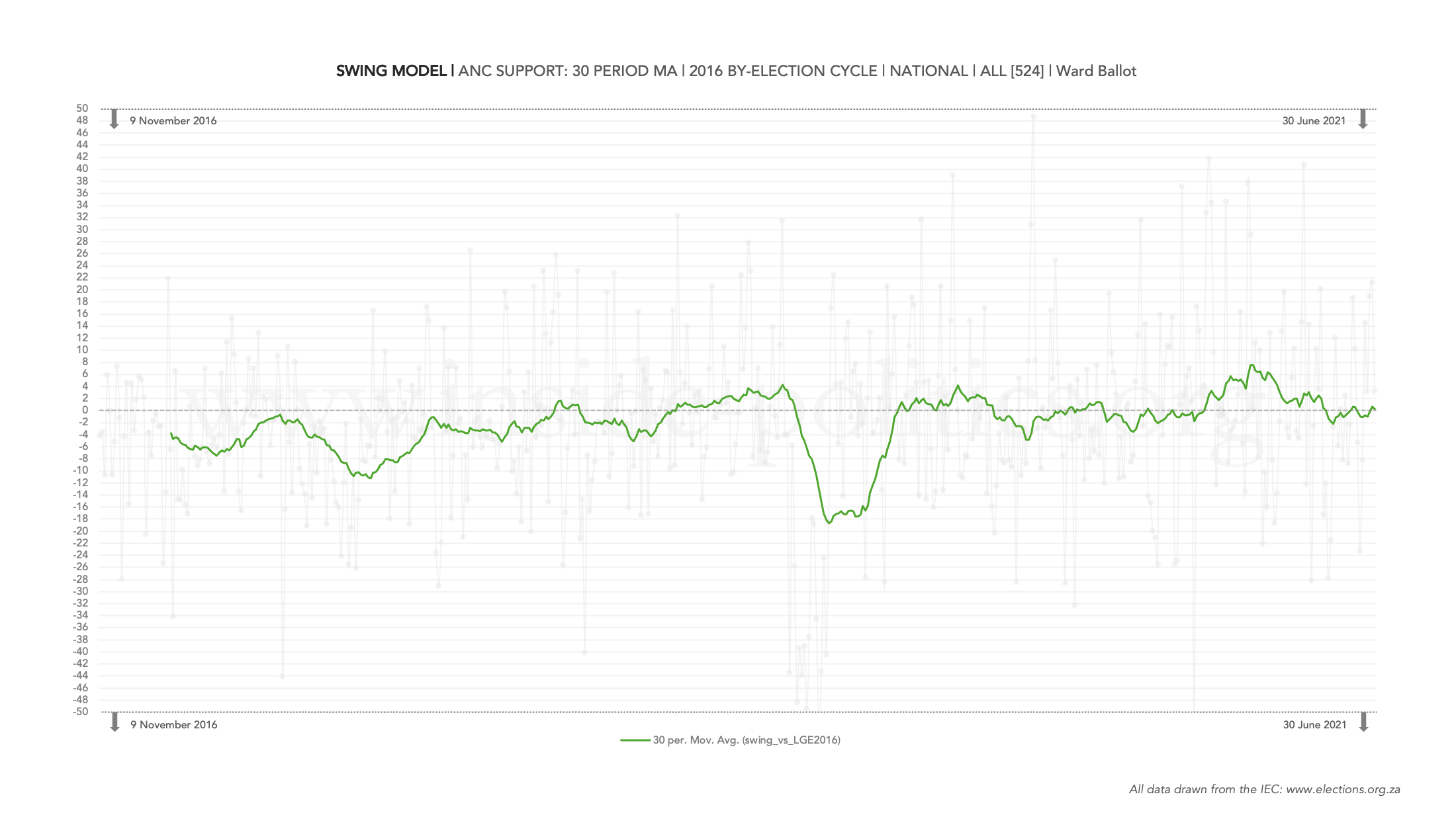 A swing model tracks change in support for either the ANC, DA or EFF per cycle (you can see this faded in the background). It does this by comparing each by-election result to the result in that ward in the previous LGE, then mapping the change in percentage points (either positive or negative. in brief, if a party’s average moving above 0, it is winning support; below and it is losing. So, it is a good measure of whether parties are retaining or shedding support. The core indicator remains the moving average – the solid visible line, which is set at 30 periods.
